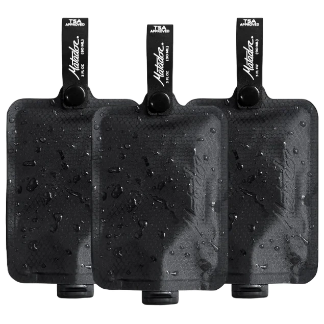 Set de trei sticluțe de călătorie Matador FlatPak Toiletry Bottle, fabricate din nylon rezistent, ideale pentru transportul șamponului, săpunului sau balsamului.