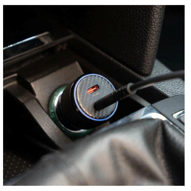 Încărcător auto Swissten cu două porturi USB-C și suport PD 3.0 oferă un total de până la 50W, permițând încărcarea rapidă și sigură a două dispozitive simultan.