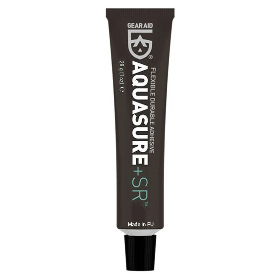 Aquasure +SR™ 28g de la Gear Aid este un adeziv pe bază de poliuretan pentru repararea încălțămintei, în special a tălpilor și a pânzei grele (cum ar fi copertinele,...). Dintre adezivii pe bază de solvenți organici ai Gear Aid Aid, acesta are cea mai mare vâscozitate, formează cel mai puternic strat, iar stratul de cauciuc PU polimerizat are cea mai mare duritate. Acesta permite reconstrucția benzii de rulare din cauciuc a pantofului și, prin saturarea suprafeței adezivului nepolimerizat cu un material cristalin solubil (de exemplu, sare, zahăr etc.), se poate crea un relief antiderapant.