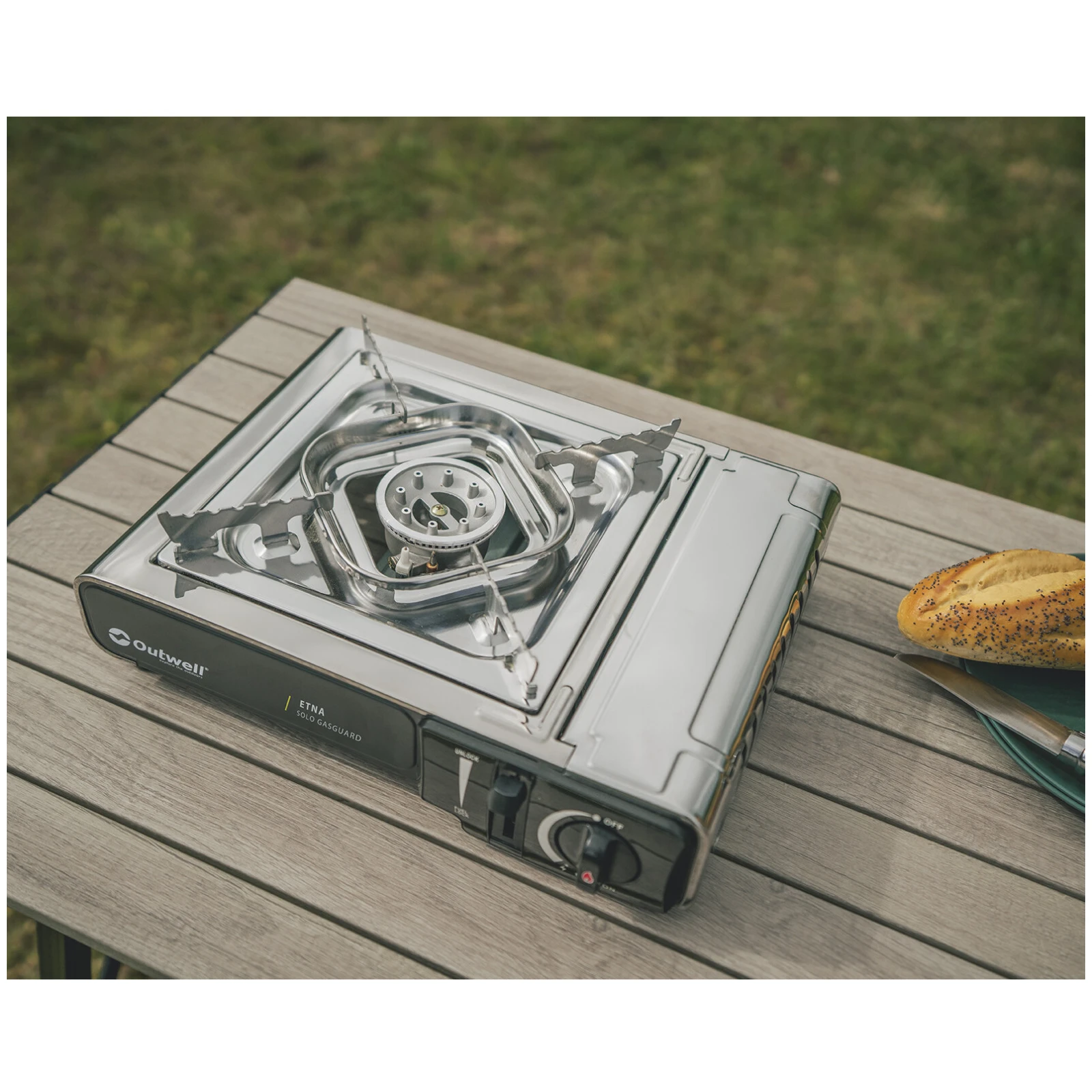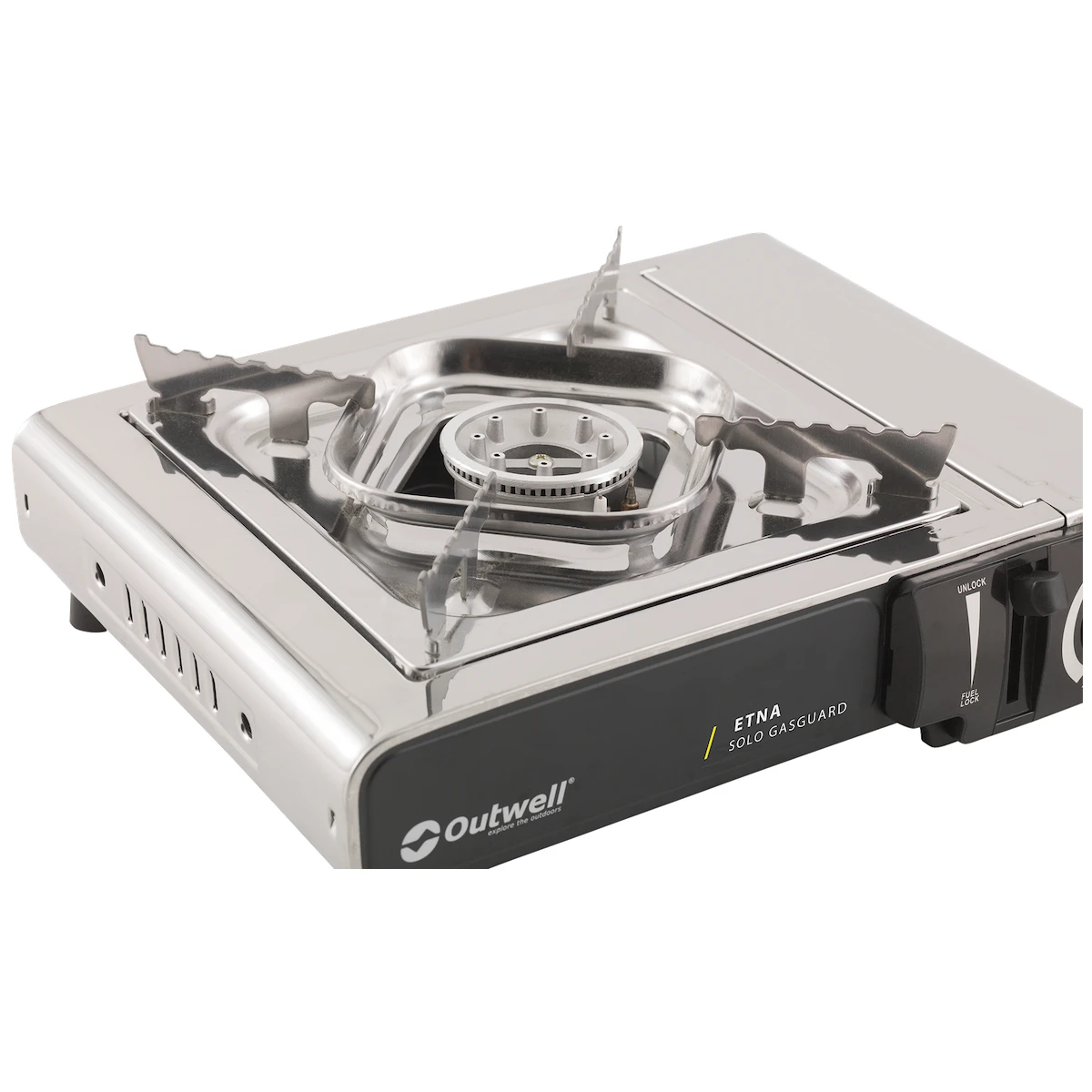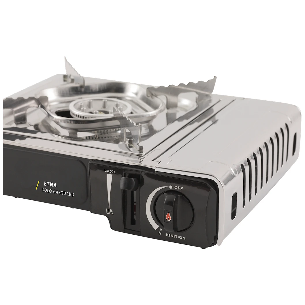 Aragazul pe gaz cu un singur arzător Etna Solo Gasguard de la producătorul danez Outwell este un ajutor indispensabil pentru camping și grădină. Materialul din oțel și oțel inoxidabil garantează o durată lungă de viață. Construcția este joasă, foarte stabilă datorită piciorușelor de plastic, iar arzătorul este echipat cu un grătar lat pentru așezarea sigură a recipientului.