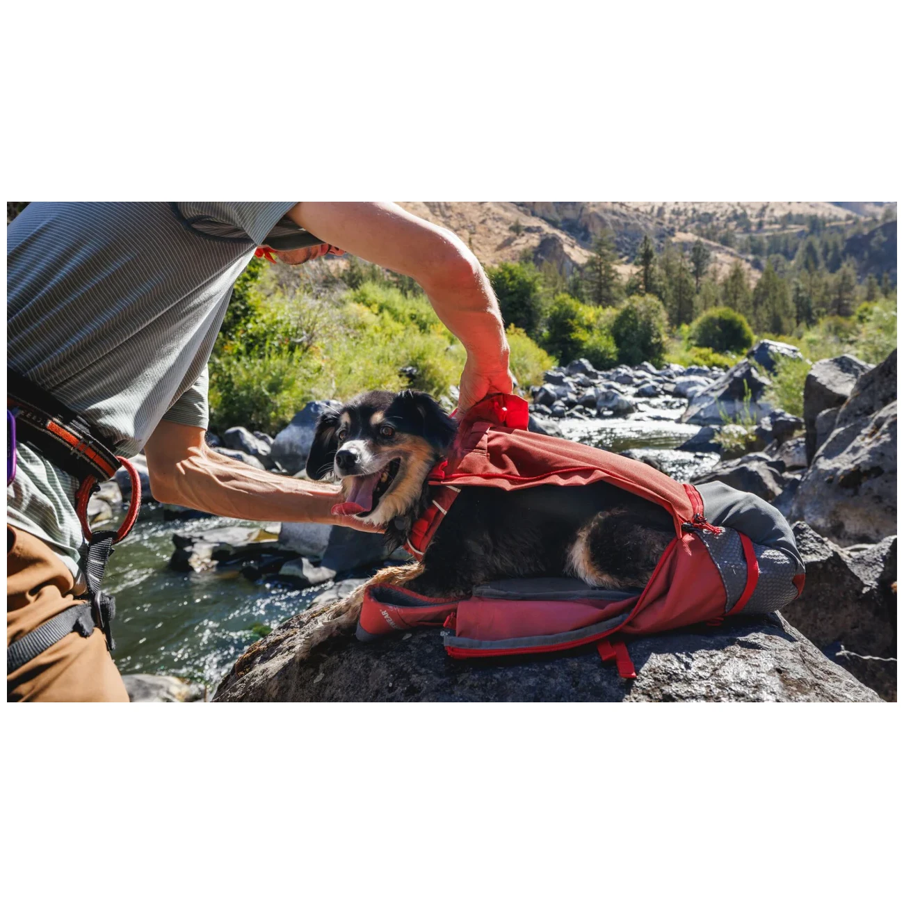 Ruffwear Hitch Hiker™ Dog Backpack Carrier permite transportul sigur al câinelui pe spatele proprietarului. Acest lucru este util în momentele în care trebuie să depășiți secțiuni tehnice dificile în munți, cum ar fi via ferrata, să traversați secțiuni cu bicicleta care nu sunt potrivite pentru câine, dar este util și pentru proprietarii de căței sau de câini seniori care parcurg distanțe mai scurte.