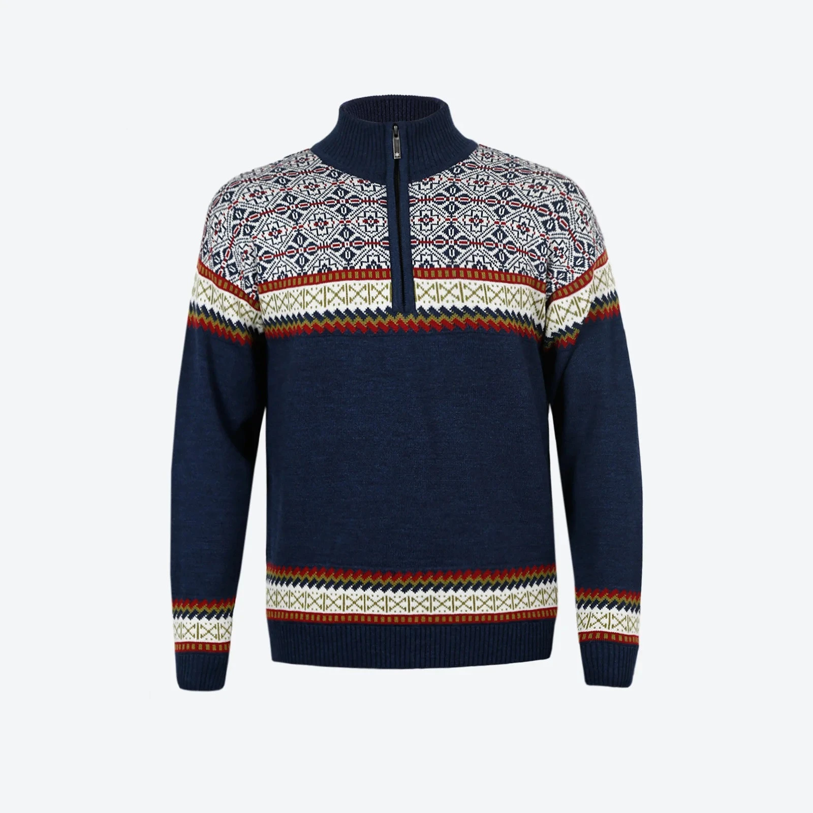 Puloverul unisex din lână pură combină modelul tradițional norvegian cu o croială modernă și un guler practic cu fermoar.