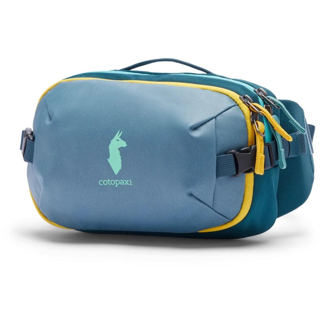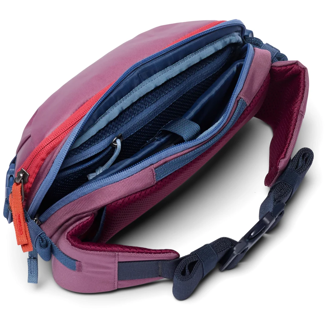 BorsetaAllpa X 3L Hip Pack de la brandul Cotopaxi este unul dintre membrii mai mici ai colecției de călătorii Allpa și poate fi purtată în timpul excursiilor. Este fabricată din materiale reciclate în proporție de 100% - în special coaja din nailon reciclat și partea interioară din poliester reciclat. Poate fi ușor depozitată în buzunarul superior al rucsacului Allpa 35L sau 42L.