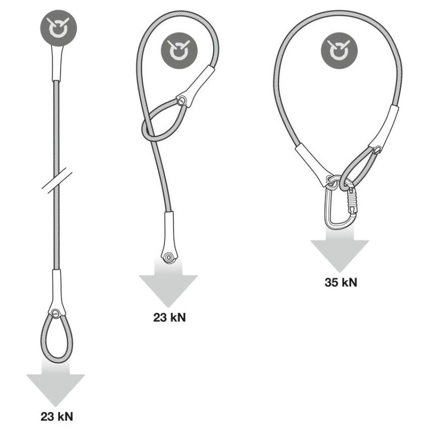 Oferă mai multe variante de instalare a punctului de ancorare: direct în punctul de ancorare cu ajutorul carabinierelor sau prin înfășurarea în jurul unei structuri adecvate. Protectorul de plastic ajută la menținerea carabinierei pe loc și facilitează închiderea acesteia.