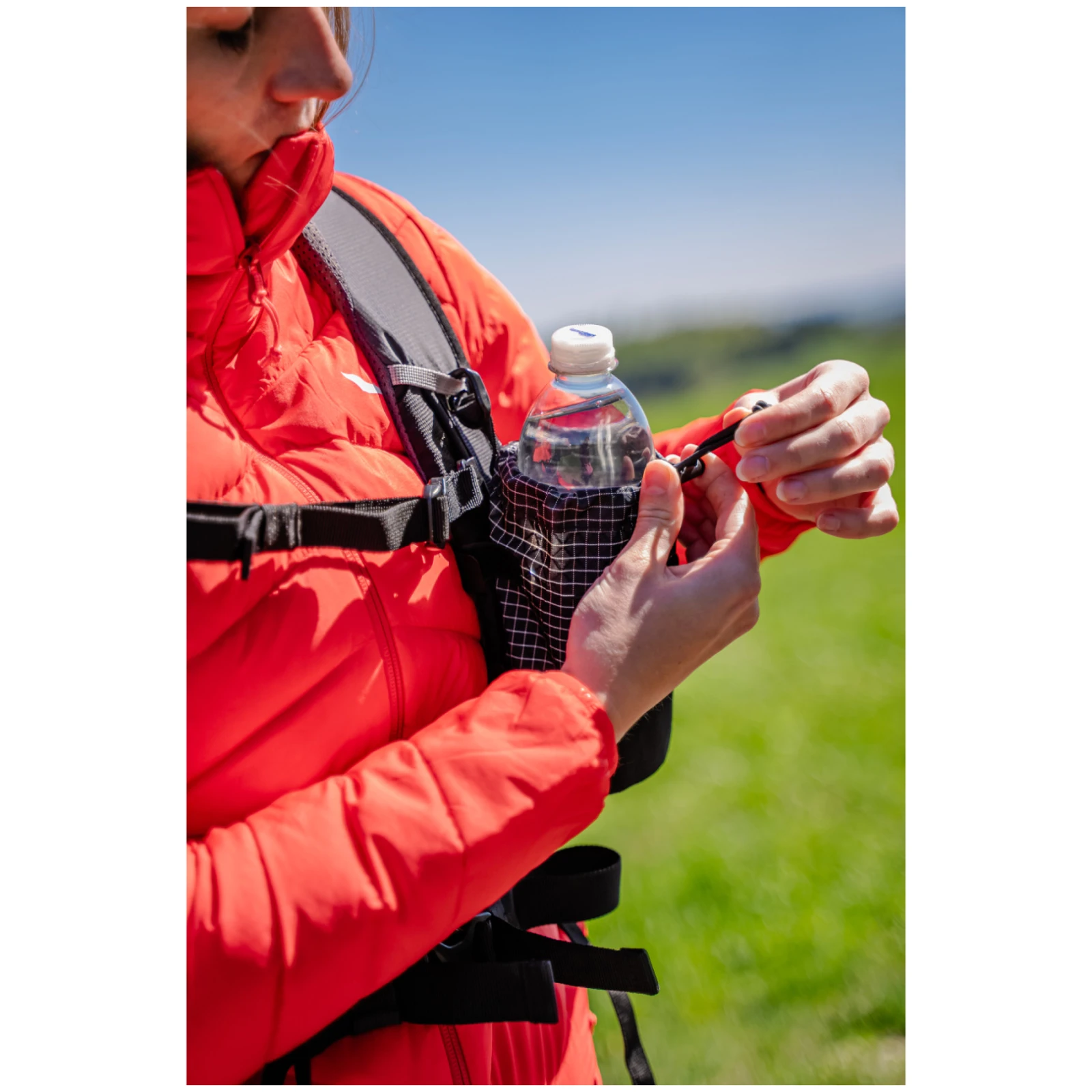 Partea din față este completată de o plasă elastică, care servește drept buzunar cu acces rapid pentru obiecte mici. Partea inferioară din plasă rezistentă permite evacuarea eficientă a umidității și previne acumularea acesteia. Warg Sticlă de Drum oferă o soluție practică și rapid accesibilă pentru depozitarea sticlei, atât în drumeții, cât și în utilizarea zilnică.