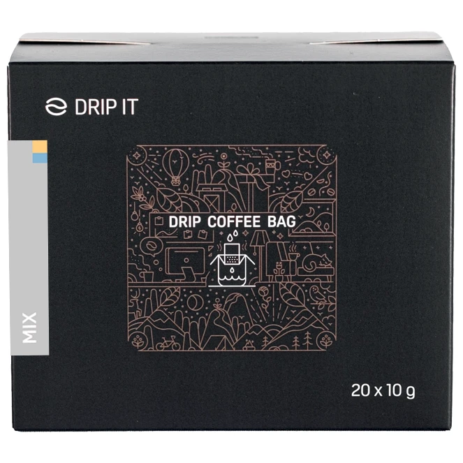 Cafea de calitate pentru călătorii Mix - Columbia, Honduras 20x10 g de la Drip it. 100% Arabica de calitate superioară, prăjită mediu, este măcinată direct în filtru, astfel încât pentru preparare aveți nevoie doar de apă fierbinte.