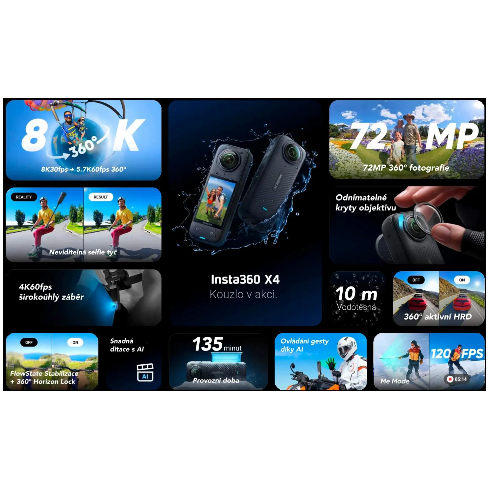 Marca Insta360 oferă o gamă largă de camere video și accesorii orientate spre captarea creativă a imaginii – de la camere video 360° și camere video de acțiune „mici”, până la module profesionale. De exemplu, modelul Insta360 X4 oferă filmări la 360 de grade în rezoluție 8K și îi permite utilizatorului să „aleagă ulterior” unghiul de filmare – datorită faptului că surprinde totul în jur.