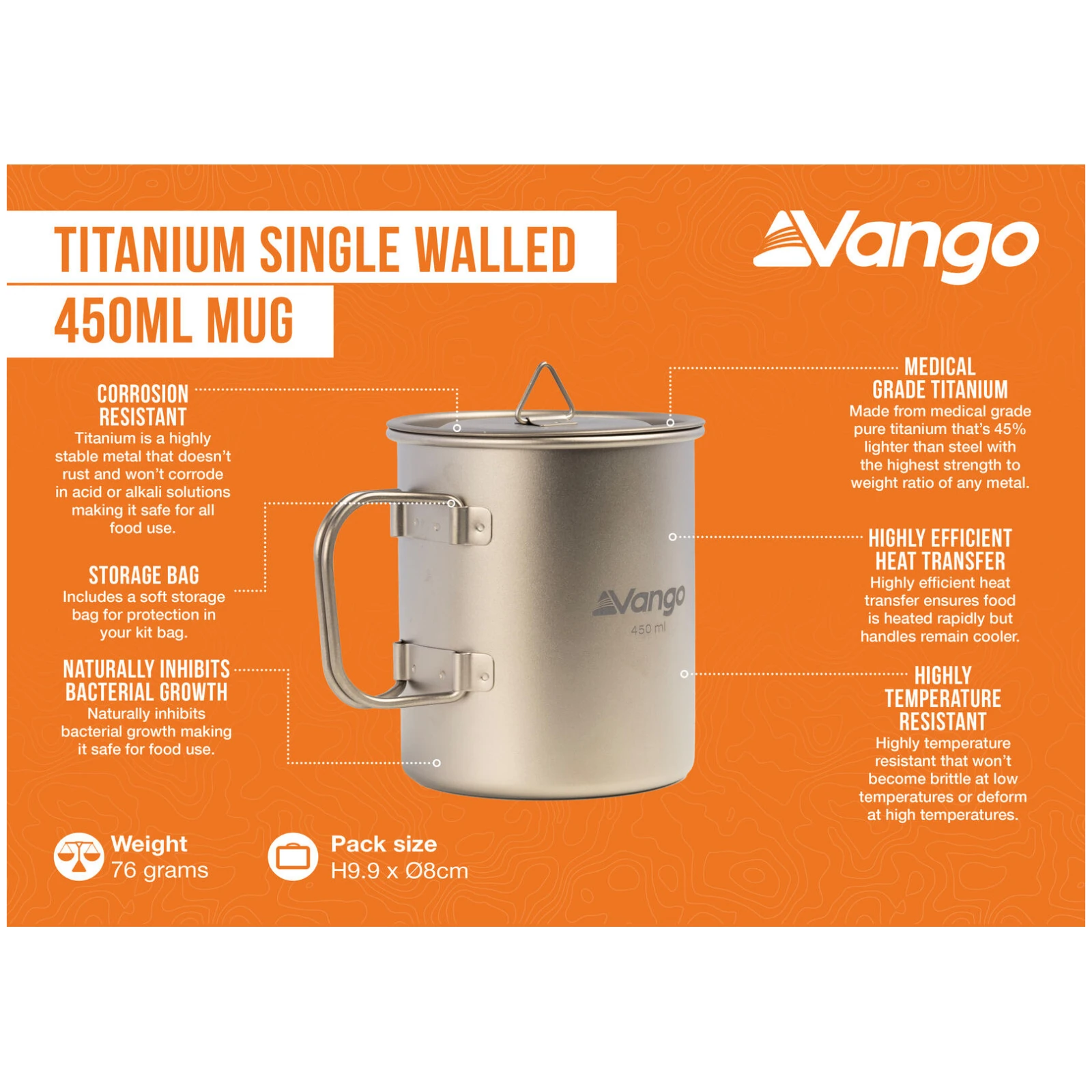 Cană Titanium Single Walled Mug 450 ml Vango este concepută pentru toți cei care doresc funcționalitate maximă la o greutate minimă. Este fabricată din titan pur de calitate medicală, unul dintre cele mai ușoare și rezistente metale existente. Datorită construcției cu un singur perete și a transferului excelent de căldură, cana este ideală nu doar pentru băut, ci și pentru gătit sau încălzirea unor mese simple direct pe sursa de căldură.