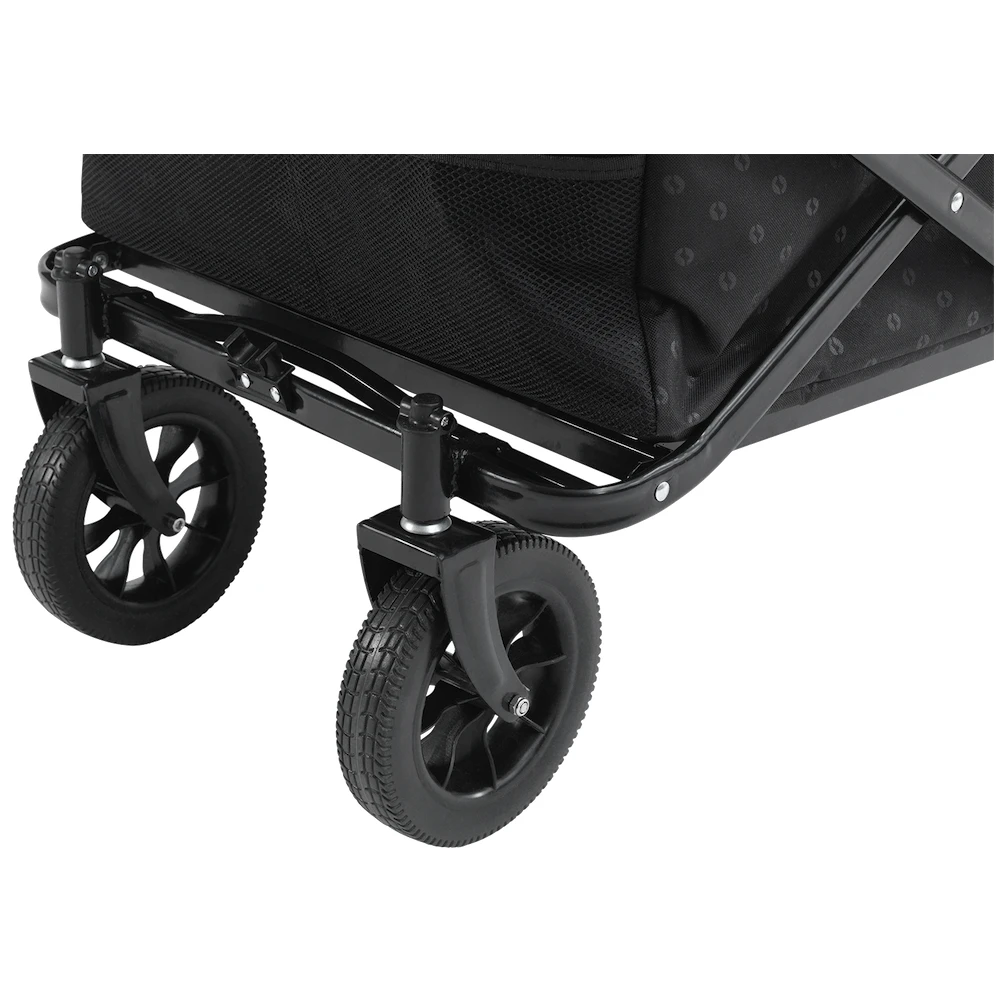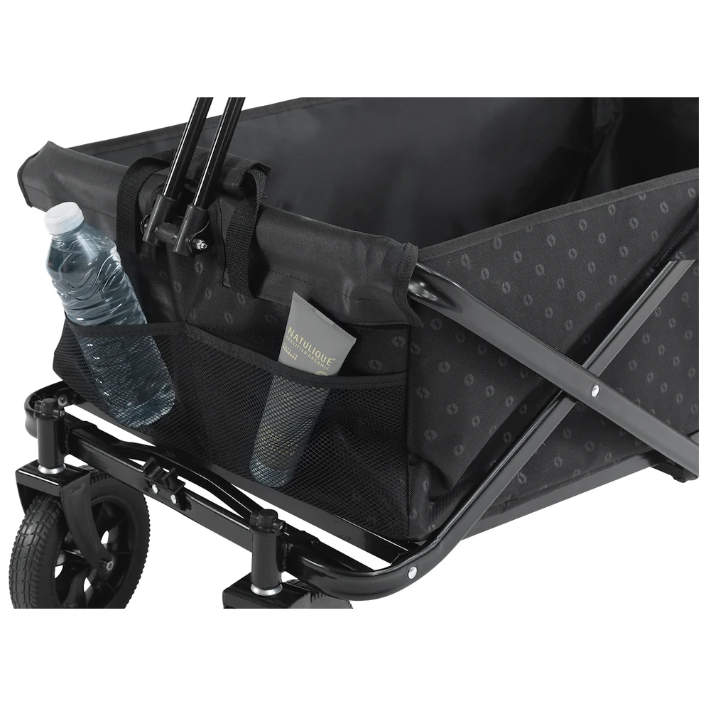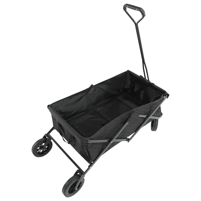 Căruciorul este echipat cu o construcție din oțel robust și rezistent, datorită căreia poate fi pliat și desfăcut în câteva secunde. Printre alte avantaje se numără roțile rezistente din poliuretan, cu care nu trebuie să vă temeți nici de terenul denivelat. Roțile sunt, de asemenea, rezistente la perforații și la impact .Cu siguranță veți aprecia și mânerul telescopic, care poate fi extins până la 120 cm de la sol și care poate fi blocat în poziție verticală. La exterior are două buzunare din plasă. Include o geantă de transport pentru depozitare și transport ușor.