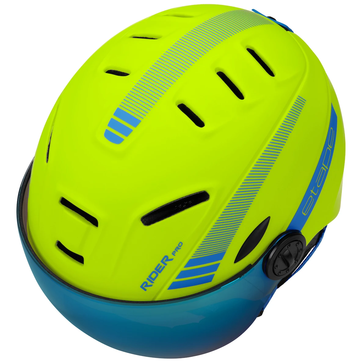 Casca de schi pentru copii Rider Pro impresionează la prima vedere prin designul său modern și nivelul ridicat de manoperă. Acoperitoarele moi pentru urechi, care se conectează perfect la carcasa căștii, sporesc confortul purtării, dar protecția capului nu este compromisă. Ventilația de înaltă calitate este asigurată de 12 deschideri de ventilație cu reglare continuă. Vizieră detașabilă cu filtru categoria S2, este echipată cu tehnologia ZeroFog pentru a preveni aburirea și un strat anti-zgârieturi. Are o funcționare convenabilă, doar prin pliere, și poate fi ușor schimbată, dacă este necesar, cu un alt tip. Viziera, care face parte din cască și se potrivește perfect, și designul fără ramă asigură că zăpada de la suprafață alunecă rapid sau pur și simplu se șterge cu o mănușă, avantajul este, de asemenea, un unghi de vizualizare larg superior. Toate căștile de schi și snowboard Etape sunt aprobate în conformitate cu standardul european EN 1077 (CSN EN 1077).