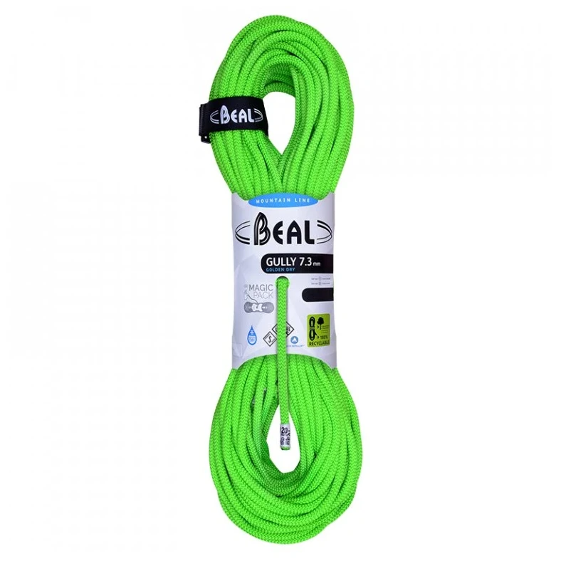 Coarda dinamică unică Beal Gully de 7,3 mm, cu o lungime de 50 de metri și cu tratament Golden Dry, este certificată atât ca jumătate, cât și ca dublă. Conceput special pentru alpinism pe gheață.