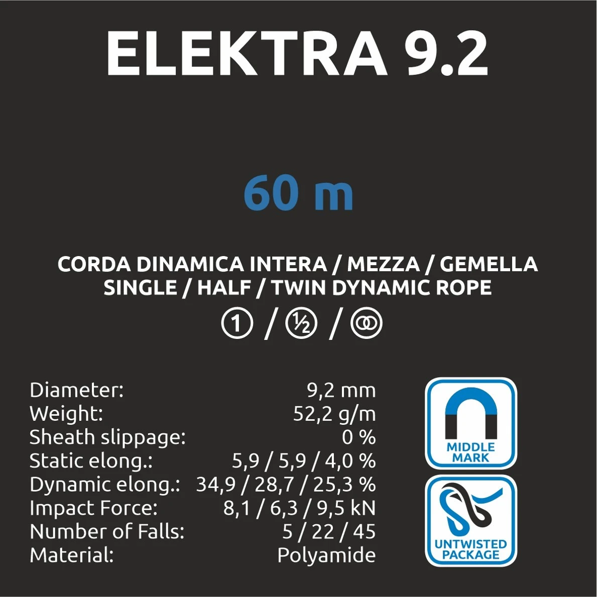 Elektra 9.2 - 60m de la marca Camp este o coardă foarte ușoară cu un diametru de 9.2. Marcaje cu cerneală marchează mijlocul corzii pentru o manevrare mai ușoară și coborâri sigure. Combinația dintre manevrarea lină și o bună alungire dinamică face din coarda idealul partener pentru cățărarea pe mai multe lungimi.