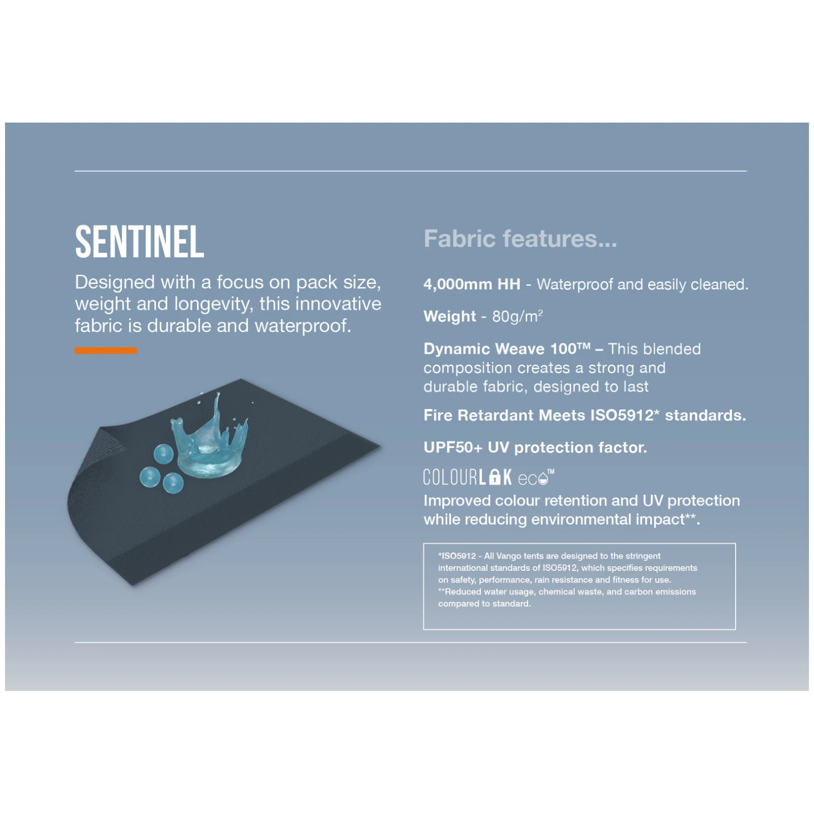 Marchiza laterală Sentinel Side Awning de la producătorul Vango este fabricată din țesătură Dinamică 100™ cu o coloană de apă de 4.000 mm HH, care se remarcă printr-un raport excelent între rezistență, greutate și dimensiuni compacte la împachetare. Datorită tehnologiei ColourLok, materialul își păstrează culoarea și proprietățile funcționale pe termen lung. Construcția este realizată din tije din fibră de sticlă PowerFlex®, care sunt ușoare, rezistente și fiabile chiar și pe vreme vântoasă.