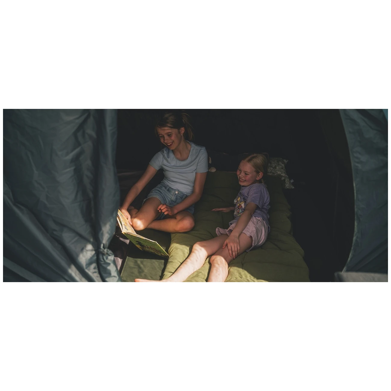 Cortul dispune de două intrări fără bariere, echipate cu plasă de țânțari, care pot fi complet rulate într-o parte. Holul spațios este echipat cu o copertină mare în fața intrării, podea detașabilă, acoperiș luminos și ferestre întunecate, care oferă suficientă lumină în interior, protejând în același timp împotriva soarelui și a radiațiilor UV. Dacă aveți nevoie de mai multă intimitate, puteți închide draperiile până la înălțimea dorită a ferestrei. În spatele holului se află două dormitoare întunecate cu plase de țânțari, oferind spațiu pentru un somn liniștit. Ușile sunt prevăzute cu benzi magnetice integrate, care permit o intrare rapidă și silențioasă în cort. Pentru o închidere mai fermă, sunt disponibile și fermoare.