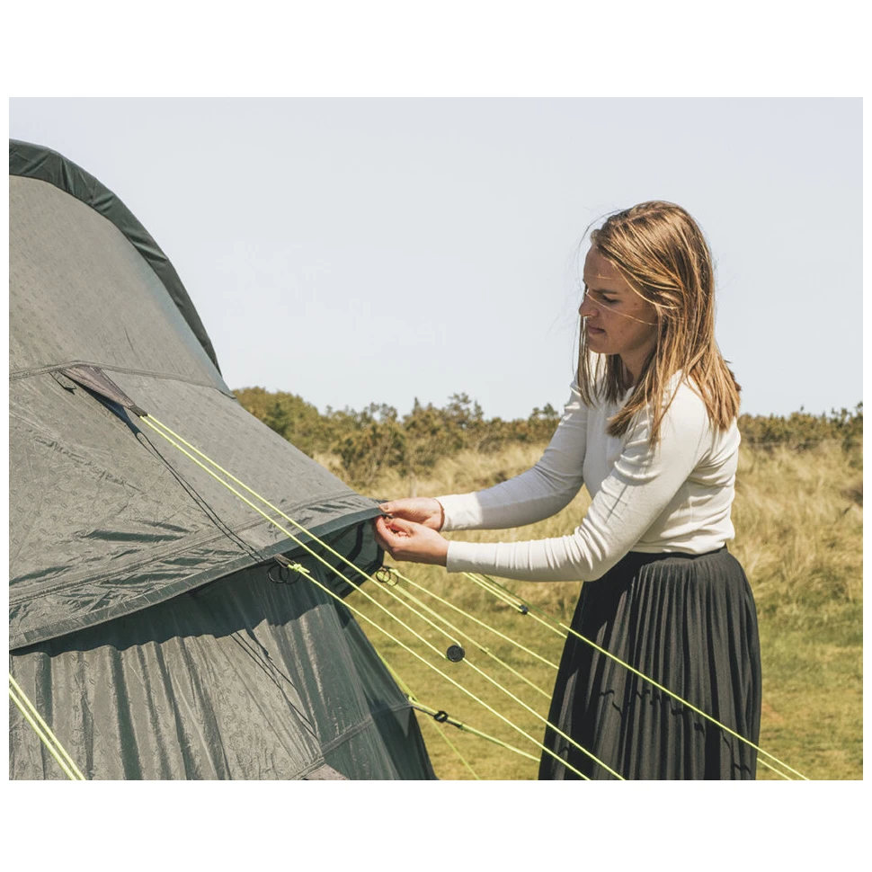 Cortul dispune de două intrări fără bariere, echipate cu plasă de țânțari, care pot fi complet rulate într-o parte. Holul spațios este echipat cu o copertină mare în fața intrării, podea detașabilă, acoperiș luminos și ferestre întunecate, care oferă suficientă lumină în interior, protejând în același timp împotriva soarelui și a radiațiilor UV. Dacă aveți nevoie de mai multă intimitate, puteți închide draperiile până la înălțimea dorită a ferestrei. În spatele antreului se află trei dormitoare întunecate, echipate cu plasă de țânțari, care oferă un spațiu ideal pentru un somn liniștit și neîntrerupt. Ușile sunt prevăzute cu benzi magnetice integrate, care permit o intrare rapidă și silențioasă în cort. Pentru o închidere mai fermă, sunt disponibile și fermoare.