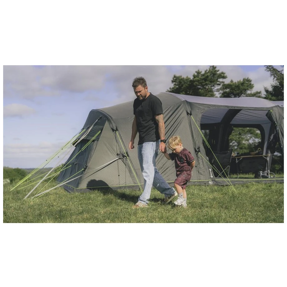 Cortul se remarcă printr-un sistem de ventilație bine conceput, buzunare de depozitare și intrări acoperite pentru cabluri prelungitoare, care permit conectarea unei lămpi sau încărcarea telefonului mobil. Cu siguranță veți aprecia sistemul de suspendare Hooktrack System, care permite atașarea accesoriilor ușoare, cablurilor și lămpilor pe „șinele” proiectate în mod special. Sistemul integrat de iluminare Outwell Light va oferi o iluminare confortabilă în interiorul cortului, alimentată de la orice sursă USB-C. Recomandăm achiziționarea separată a organizatorului Universal Tent Organizer pentru peretele exterior al dormitorului, astfel încât să aveți toate lucrurile importante la îndemână. Pachetul include o pompă de aer și o husă de transport cu bretele, care facilitează transportarea cortului.