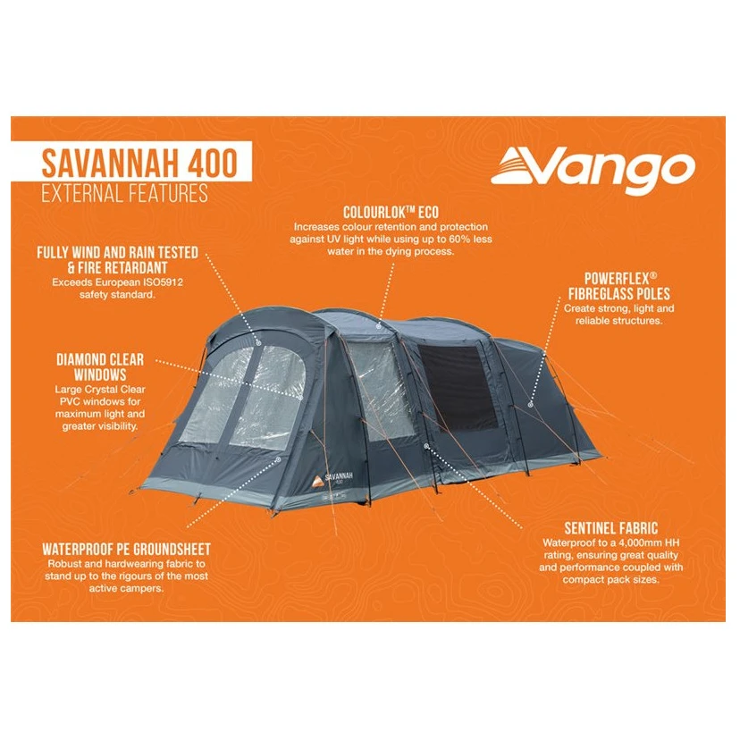 Cortul Savannah 400 Package este potrivit pentru până la 4 persoane și este construit folosind tije PowerFlex® Fiberglass care sunt ușoare, însă foarte rezistente. În interiorul cortului există două dormitoare, care pot fi separate cu ajutorul Toggled Inner Divider - un sistem de fixare cu cârlig. Dormitoarele sunt realizate din țesătura Nightfall, care blochează lumina zilei și creează condiții ideale pentru un somn bun. În plus, are o sufragerie spațioasă din 2 compartimente, care este potrivită pentru o masă de camping sau alte piese de mobilier.
