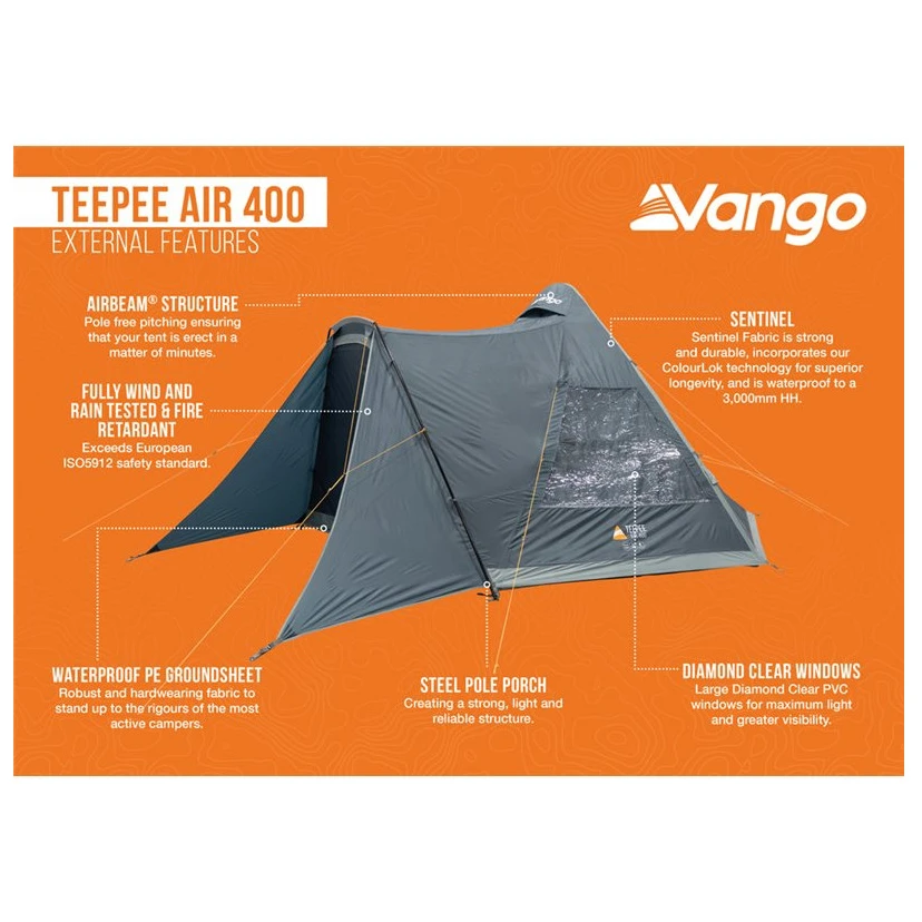 Vango Teepee Air 400 este un cort grozav pentru camping cu familia sau pentru cei care doresc mai mult spațiu și confort în natură. Acest cort are un design unic tip teepee care oferă un mediu excelent pentru relaxare și somn confortabil pentru până la 4 persoane. Datorită designului AirBeam® și a umflării simple, este ușor de montat și oferă un spațiu confortabil pentru camping.