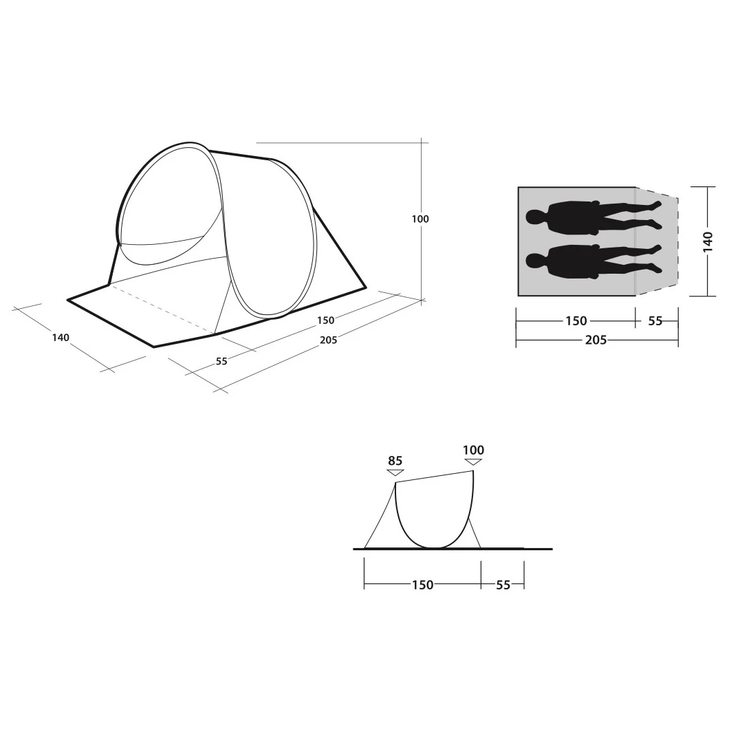 Suprafața exterioară a cortului este realizată din material Outtex® UV poliester, cu protecție împotriva radiațiilor ultraviolete UPF 50+. Podeaua integrată protejează de nisip și murdărie. În interiorul cortului există buzunare din plasă pentru depozitarea obiectelor mici. Închiderea cortului se face prin ridicarea podelei extinsă în față.
