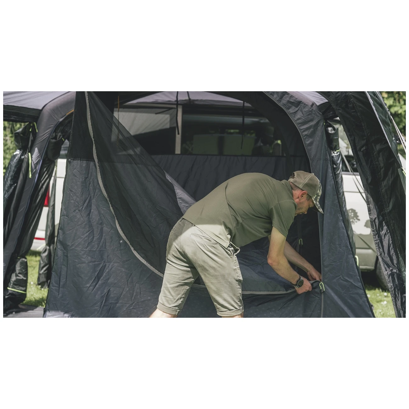 În cort duce intrarea principală mare, fără prag, cu plasă de țânțari. Poate fi complet trasă lateral, pentru a nu incomoda, sau deschisă doar în partea de sus pentru ventilație suplimentară. Două intrări laterale opuse permit deschiderea completă a cortului. Geamurile mari fumurii oferă multă lumină, dar și protecție UV și intimitate. Pot fi trase perdelele și spațiul poate fi întunecat pentru un somn mai bun.