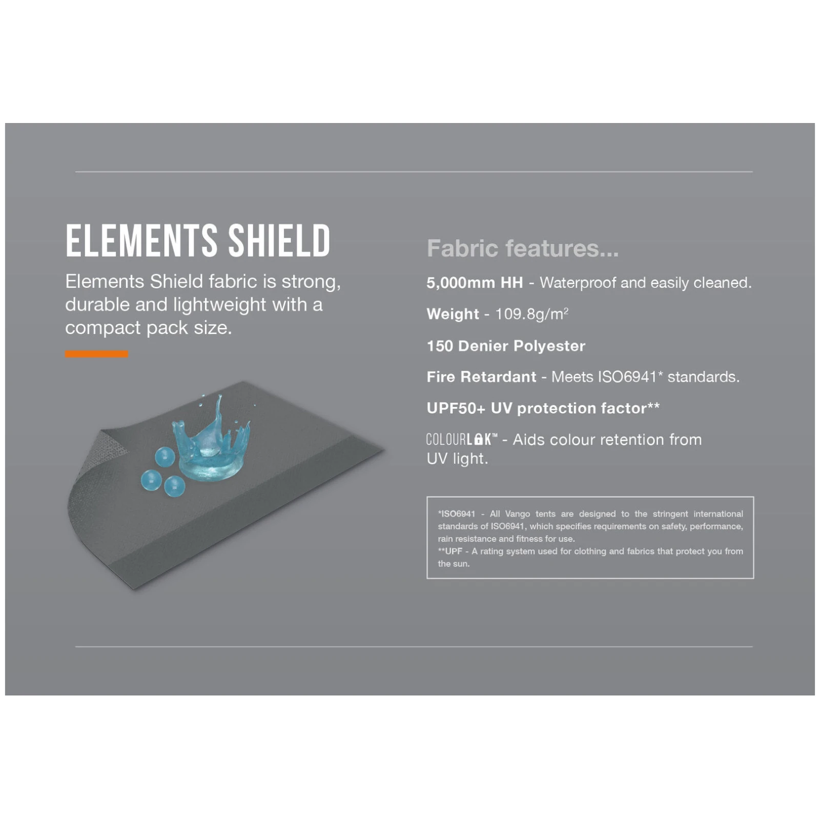 Țesătura ușoară, dar rezistentă, Elements Shield 150D, cu o coloană de apă de 5.000 mm, asigură o protecție fiabilă împotriva ploii și a condițiilor meteorologice nefavorabile, în timp ce tehnologia ColourLok ajută la menținerea culorilor vibrante chiar și în timpul utilizării frecvente. Ferestrele mari Diamond Clear oferă o vedere excelentă asupra împrejurimilor și suficientă lumină naturală, în timp ce draperiile cu fermoar permit o reglare ușoară a intimității, după cum este necesar.