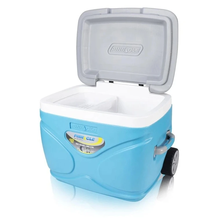Lada frigorifică portabilă cu roți Prudence 66L de la Pinnacle este umplută cu spumă poliuretanică groasă, care asigură o izolare termică excelentă și, datorită acestui fapt, vă menține băuturile și alimentele reci/calde ore întregi. Construcția ușoară, mânerul telescopic și roțile permit o mișcare ușoară, în timp ce mânerele laterale facilitează ridicarea. Capacul cutiei poate servi drept blat de lucru sau măsuță cu locuri confortabile pentru băuturi, datorită cărora cutia sau cana nu se vor răsturna. Fabricat din plastic de înaltă calitate fără BPA, care este ușor de întreținut și sigur pentru contactul cu alimentele.
