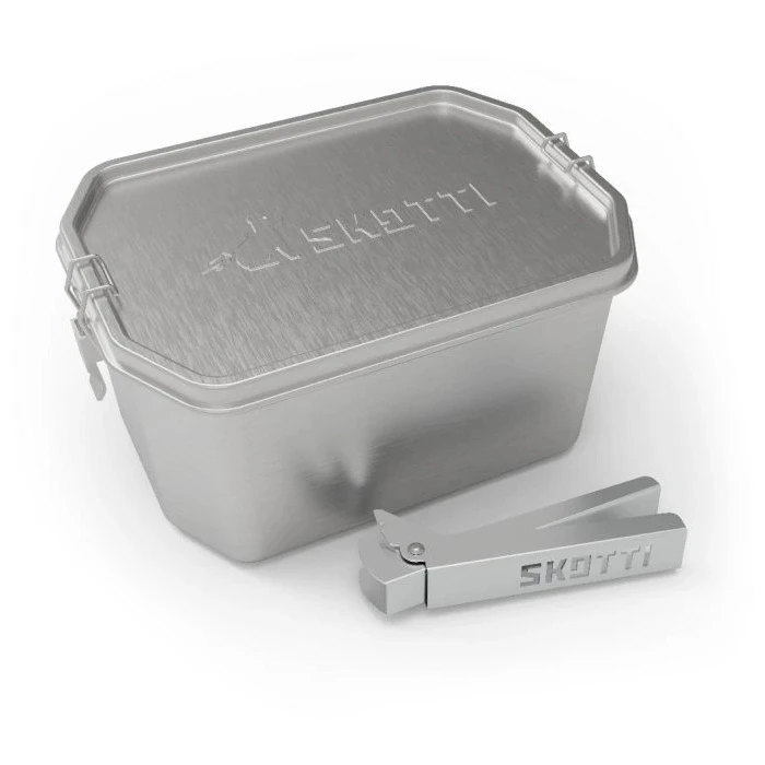 Cutia de mâncare SKOTTI 2,5L este un recipient multifuncțional din oțel inoxidabil care extinde posibilitățile grătarului pliabil SKOTTI și servește, de asemenea, ca cutie de mâncare rezistentă. Datorită cleștelui robust din aluminiu, cutia poate fi apucată în siguranță și folosită direct pe grătar ca o oală sau tigaie mai mică, ceea ce este util, de exemplu, pentru încălzirea sosului, fierberea pastelor sau prăjirea legumelor. Fundul cutiei ocupă exact jumătate din grătar, permițându-vă să gătiți și să faceți grătar simultan pe cealaltă jumătate.