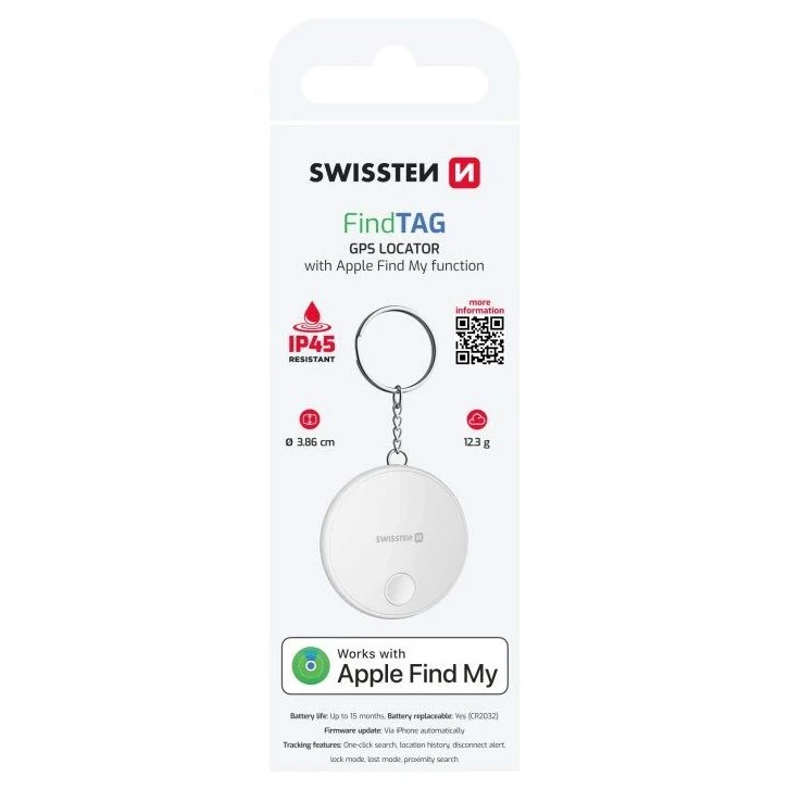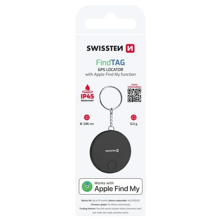 Swissten Find Tag este un localizator inteligent compact, care te ajută să găsești rapid chei, portofel, geantă sau alte obiecte de valoare pierdute. Datorită integrării în rețeaua Apple Find My, funcționează direct cu iPhone și iPad, fără a fi necesară instalarea de aplicații suplimentare. Buzerul încorporat și localizarea precisă asigură că îți vei găsi întotdeauna obiectele cu ușurință, chiar și în condiții dificile. Corpul rezistent din plastic ABS cu protecție IP45 și autonomia bateriei de până la 15 luni fac din Find Tag un companion de încredere pentru fiecare zi.