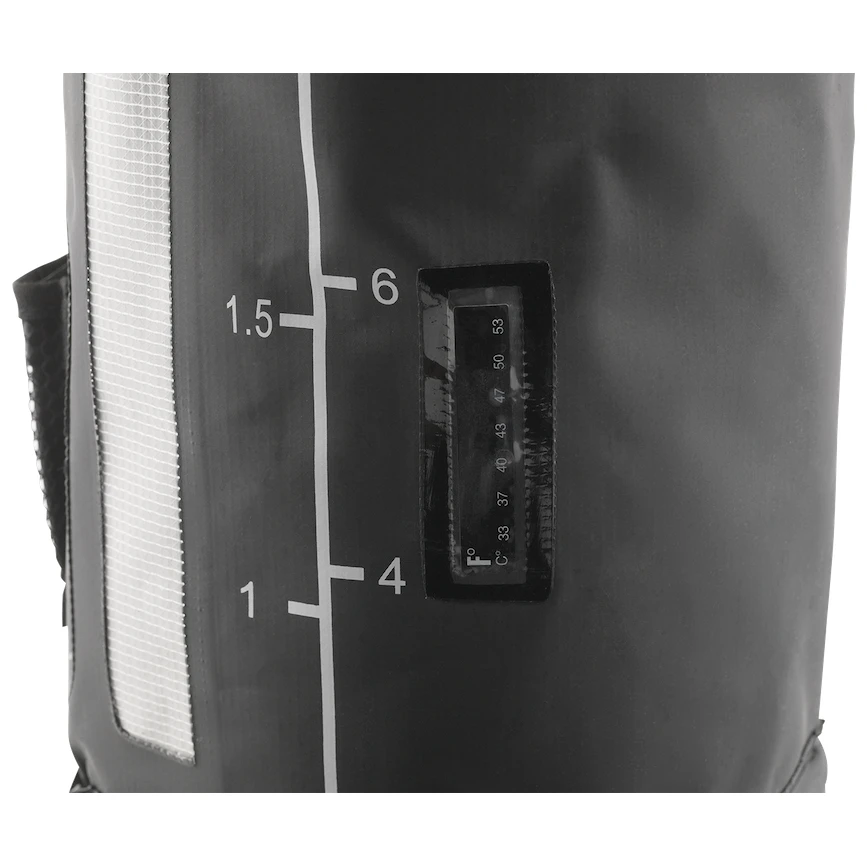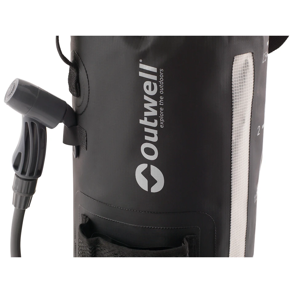 Dușul este fabricat din PVC rezistent de culoare neagră, astfel încât apa din interior se încălzește plăcut la soare. În momentul în care nu aveți nevoie de duș, îl puteți plia cu ușurință datorită materialului moale și îl puteți depozita în rucsac. Pe partea exterioară este amplasat un termometru cu o scară de la 33°C la 53°C, datorită căruia veți avea întotdeauna o imagine de ansamblu asupra temperaturii apei și un indicator de nivel transparent. Transportul și agățarea sunt mai ușoare datorită mânerului rezistent. Pomparea apei este manuală, cu ajutorul unei pompe manuale. Apa curge apoi prin furtun la duș, care este blocabil în cazul în care trebuie să faceți duș fără a folosi mâinile.