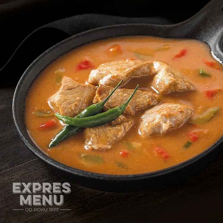 Pentru persoanele iubitoare de mâncare iute firme Expres menu a preparat acest fel de mâncare picant. Mâncarea conține carne de porc, murături, ardei capia, ardei iute și ceapă. Ca și garnitură puteți să preparați orez.