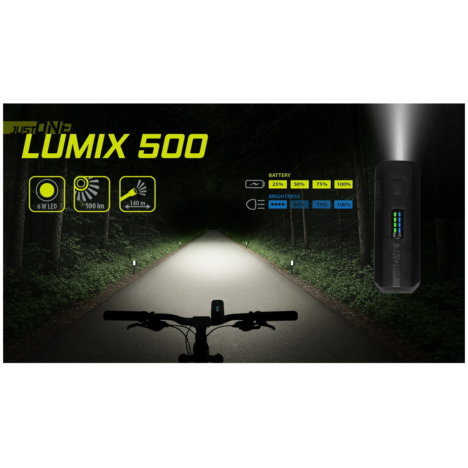 Iluminare fiabilă pentru fiecare cursă – farul Just One LUMIX 500 este accesoriul ideal pentru cicliștii care caută o lumină puternică, compactă și rezistentă pentru deplasarea în siguranță în condiții de vizibilitate redusă. Cu o diodă LED albă puternică de 6W, oferă un flux luminos de până la 500 de lumeni și o rază de acțiune de aproximativ 140 de metri, astfel încât să vedeți și să fiți văzut în siguranță chiar și pe întuneric. Datorită celor patru moduri de iluminare – trei intensități și intermitent – puteți adapta lumina la condițiile actuale.