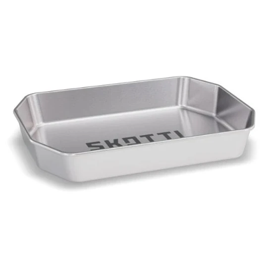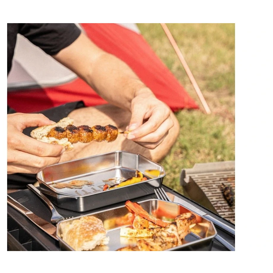 Placa de camping SKOTTI din oțel inoxidabil rezistent oferă o formă pătrată practică pentru depozitare eficientă și utilizare ușoară în timpul călătoriilor și gătitului în aer liber.