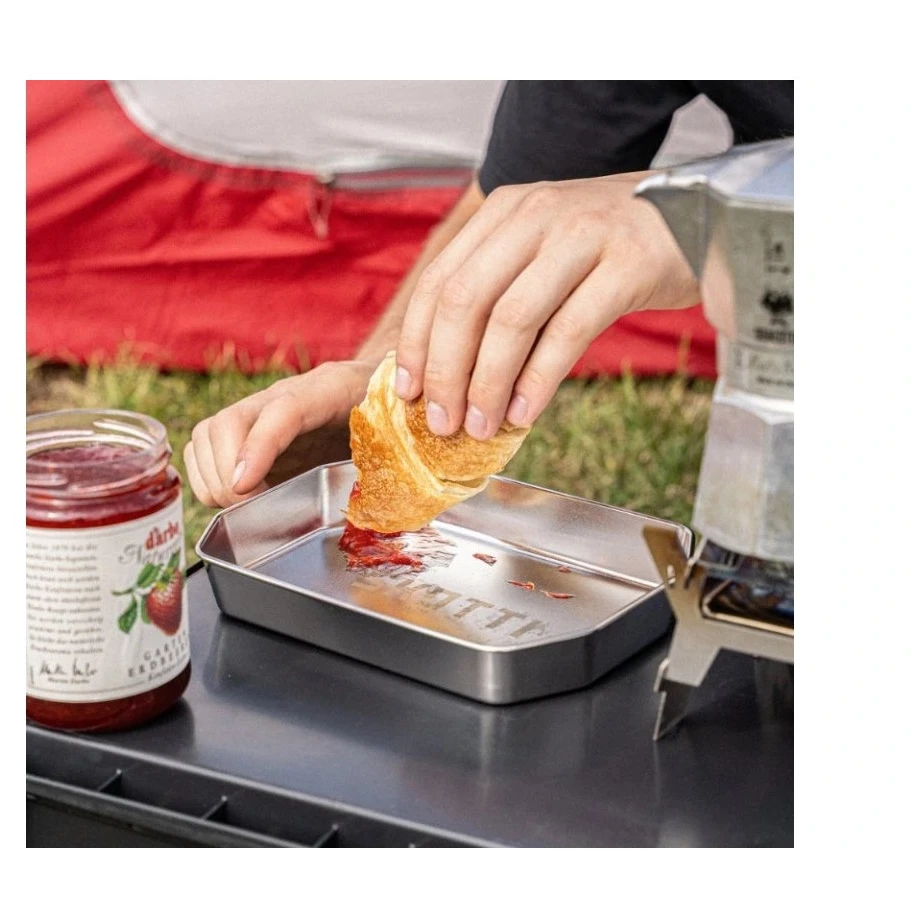 Farfuria SKOTTI este o farfurie de camping cu o formă practică, pătrată, pentru depozitare ușoară și utilizare eficientă a spațiului. Datorită dimensiunilor sale, este potrivită nu doar pentru camping, ci și pentru picnicuri, călătorii cu mașina și întâlniri în grădină. Se potrivește perfect sub cutiile SKOTTI de 1 L și 2,5 L, iar construcția sa stivuibilă economisește spațiu în rucsac și în mașină.