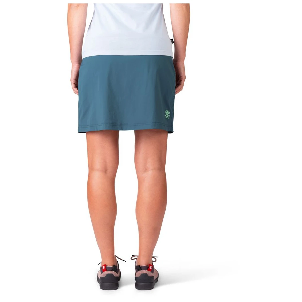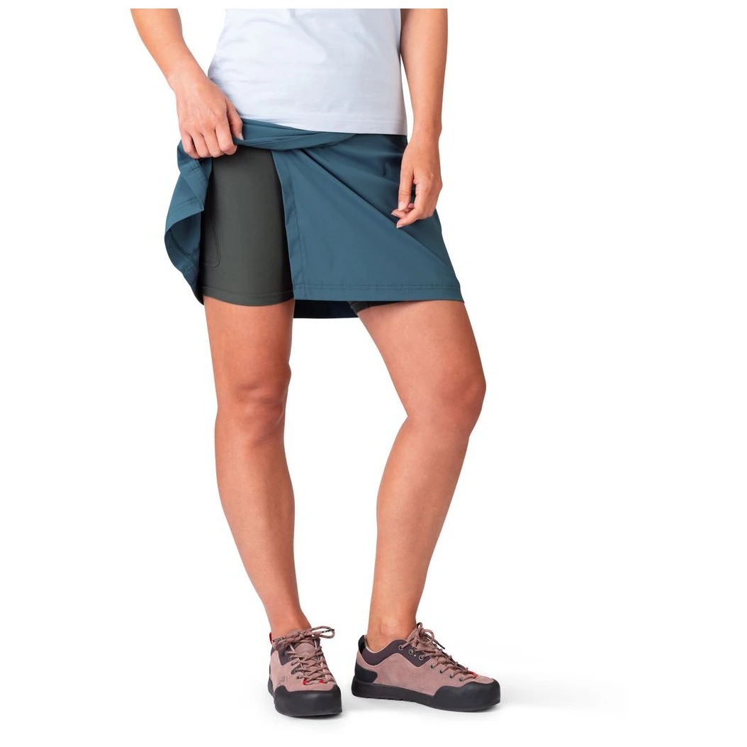 O alpinistă curajoasă în fustă? Fusta de alpinism Mandrea de la brandul Rafiki are o croială îndrăzneață și este prevăzută cu pantaloni scurți interiori. O piesă elegantă care nu trebuie să lipsească din garderobă.