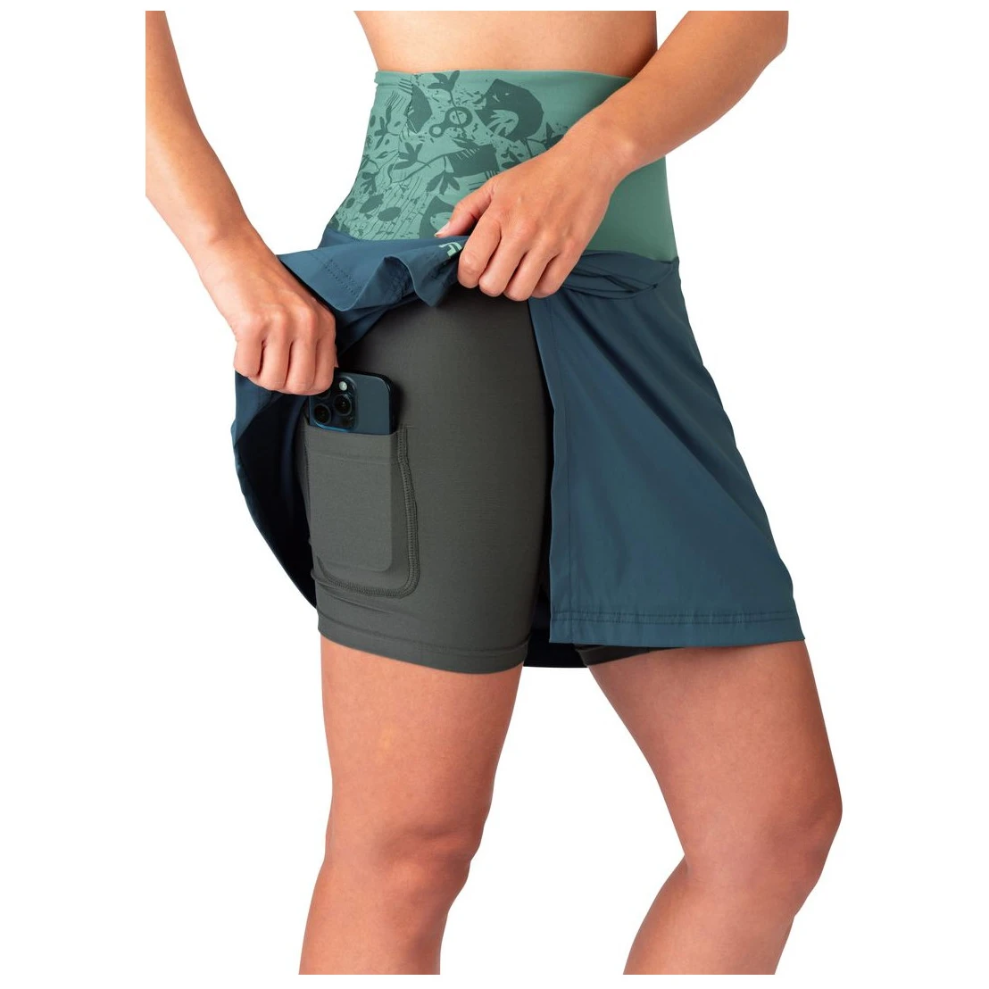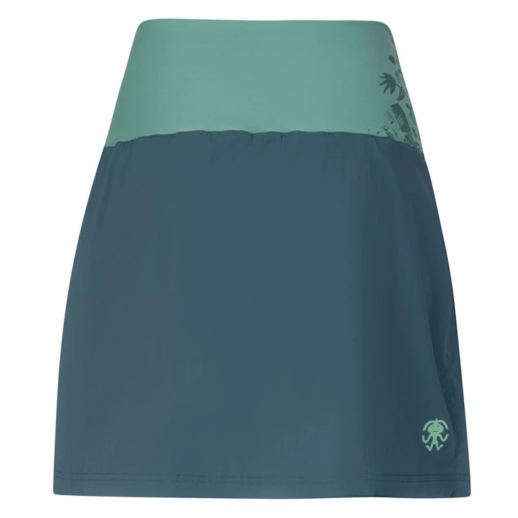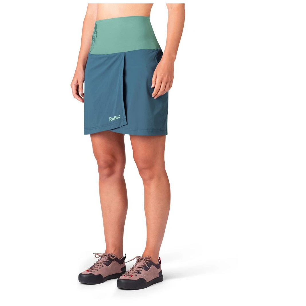 Fusta practică de escaladă cu pantaloni scurți interiori Mandrea de la brandul Rafiki este concepută pentru toate pasionatele de bouldering. Este confecționată din material ușor, flexibil, respirabil și cu uscare rapidă. Manșeta lată din talie menține fusta în poziție, astfel încât alpinistele se pot angaja în activitățile lor preferate cu o libertate maximă de mișcare. Pe coapsă există un buzunar interior pentru mărunțișuri, precum cheile sau un telefon mobil. Se poate depozita în rucsac.
