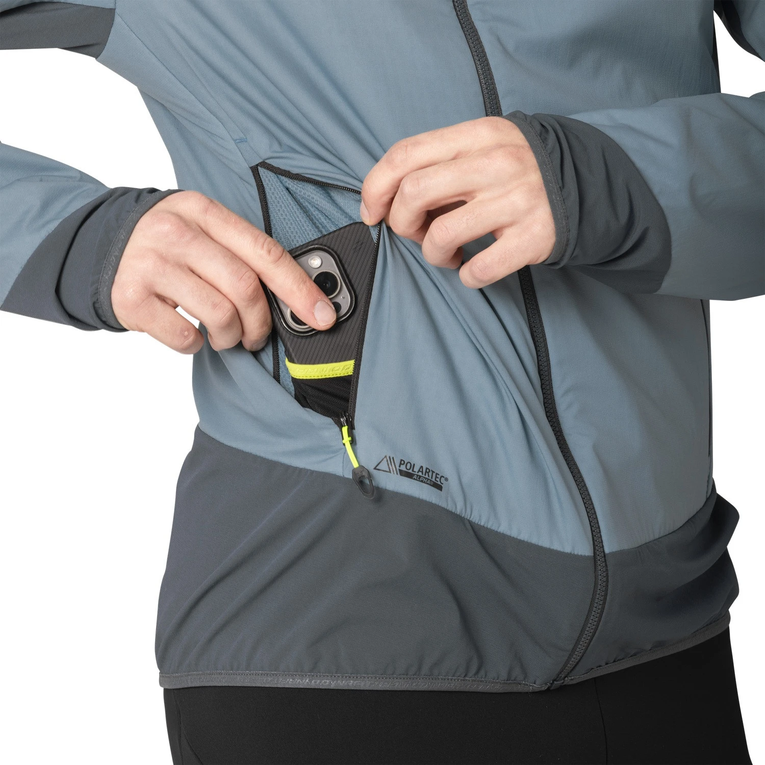Această jachetă de înaltă performanță te protejează în mod fiabil de frig și excelează prin respirabilitatea excelentă, astfel încât să nu te supraîncălzești. Stratul exterior rezistent la vânt și impermeabil previne răcirea de către vânt, în timp ce izolația Polartec® Alpha® reglează optim temperatura corpului prin eliminarea căldurii în exces. În zona în care porți rucsacul, izolația este înlocuită cu o inserție de țesătură elastică perforată pentru o respirabilitate suplimentară. Jacheta oferă o croială strânsă și inserții elastice pentru o formă perfectă, fără a aluneca în timpul mișcărilor intense. Două buzunare frontale cu fermoar oferă spațiu pentru depozitarea obiectelor mici, cum ar fi telefonul sau o gustare.