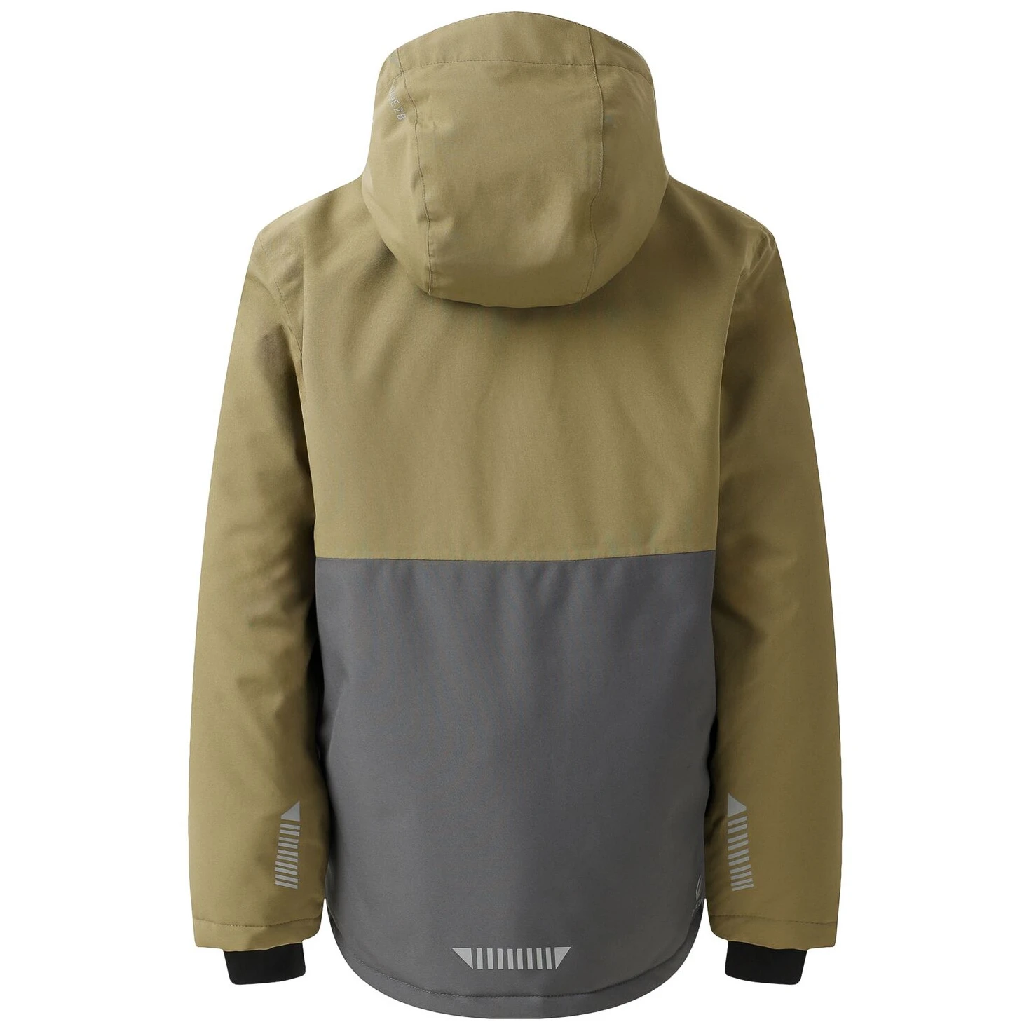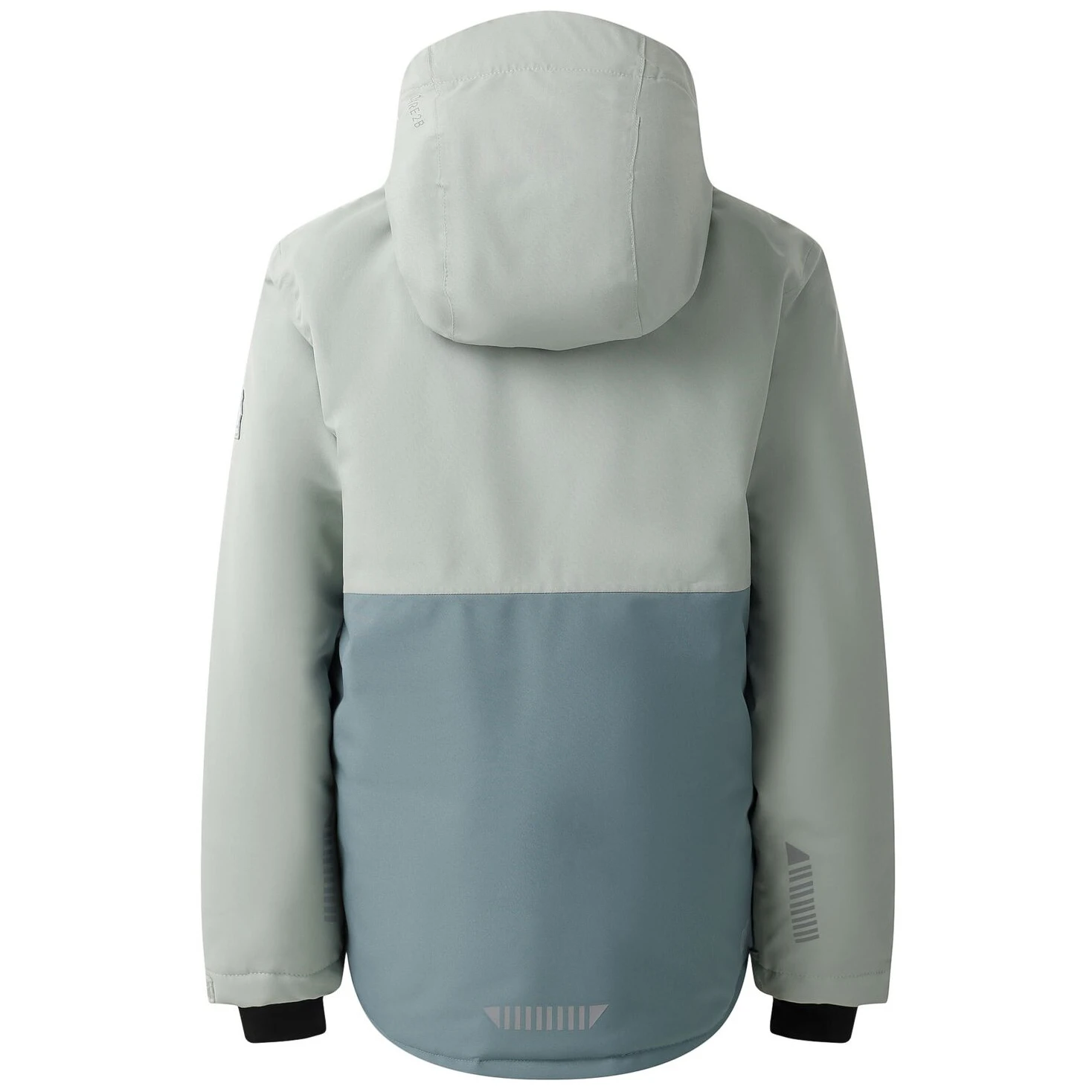 Umplutura călduroasă din poliester reciclat și căptușeala de pe spate mențin căldura corpului chiar și în zilele reci. Cusăturile lipite împiedică pătrunderea umezelii, iar echipamentul complet de schi – inclusiv fusta de zăpadă integrată, buzunarul pentru skipass și buzunarul pentru ochelari cu cârpă – fac din geacă o alegere ideală pentru micii schiori.