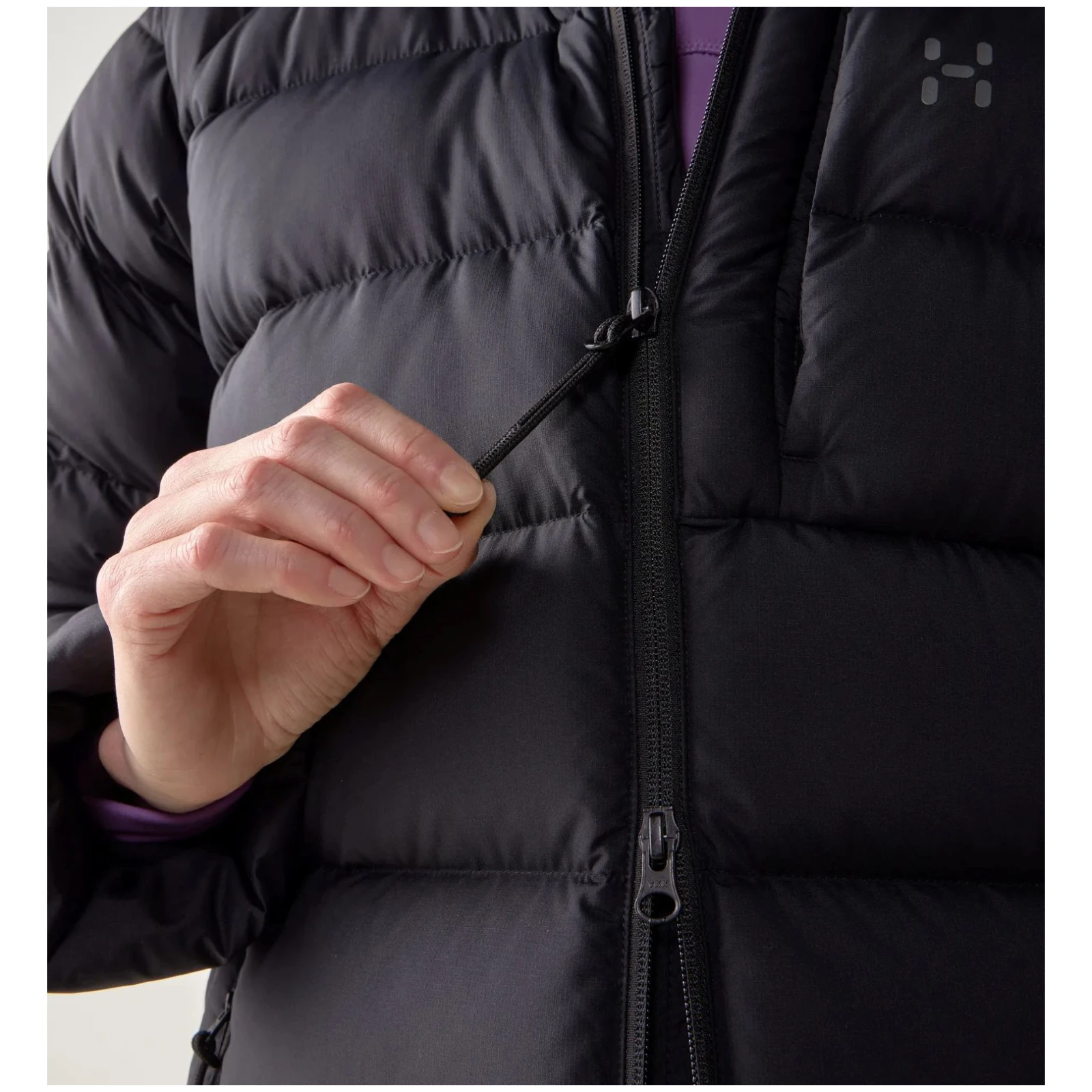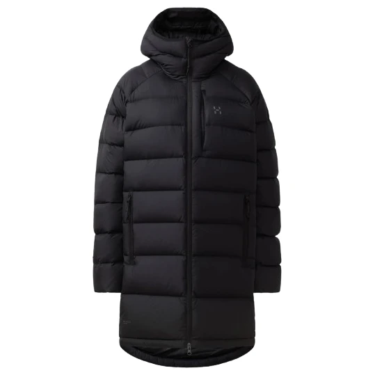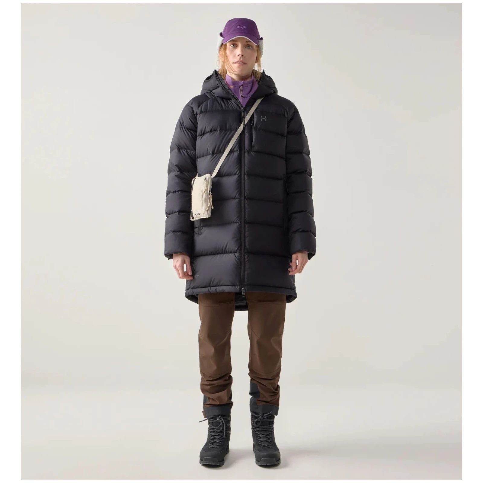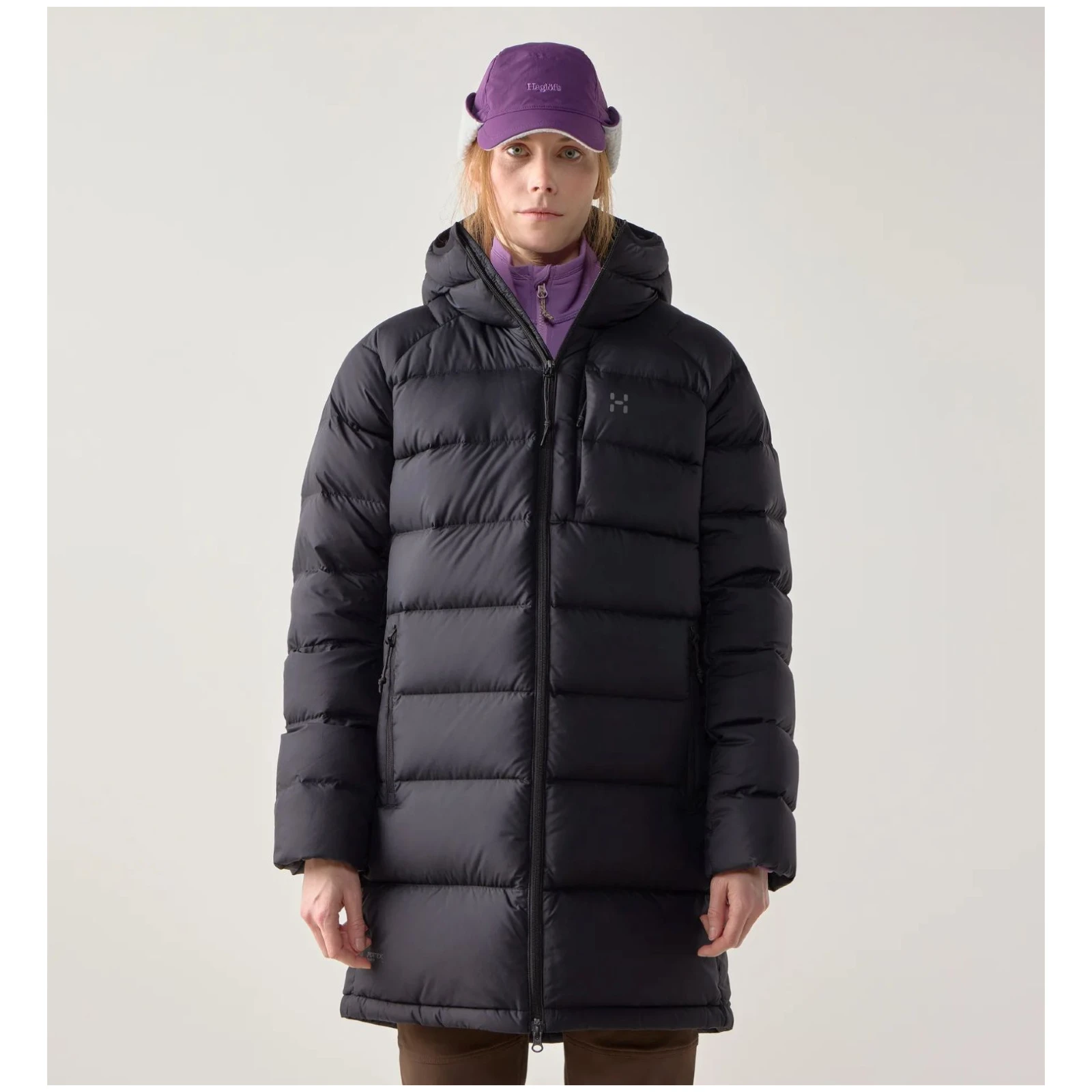 Geaca de puf pentru femei Haglöfs Rosson Down Parka este concepută pentru purtarea de zi cu zi și pentru activități în aer liber pe vreme rece. Materialul exterior este Pertex® Quantum ripstop rezistent, din poliester 100% reciclat, care este tratat cu un finisaj hidrofug fără PFC. Izolația principală este formată din puf de 600 CUIN (80% puf moale de rață, 20% puf mai dur de rață), certificat conform standardului Responsible Down Standard (RDS) și aprobat de organizația bluesign®. În zonele predispuse la uzură, cum ar fi gluga și umerii, este adăugat izolator sintetic Mimic Silver din poliester reciclat de 100 g/m², care își menține căldura chiar și atunci când este umed.