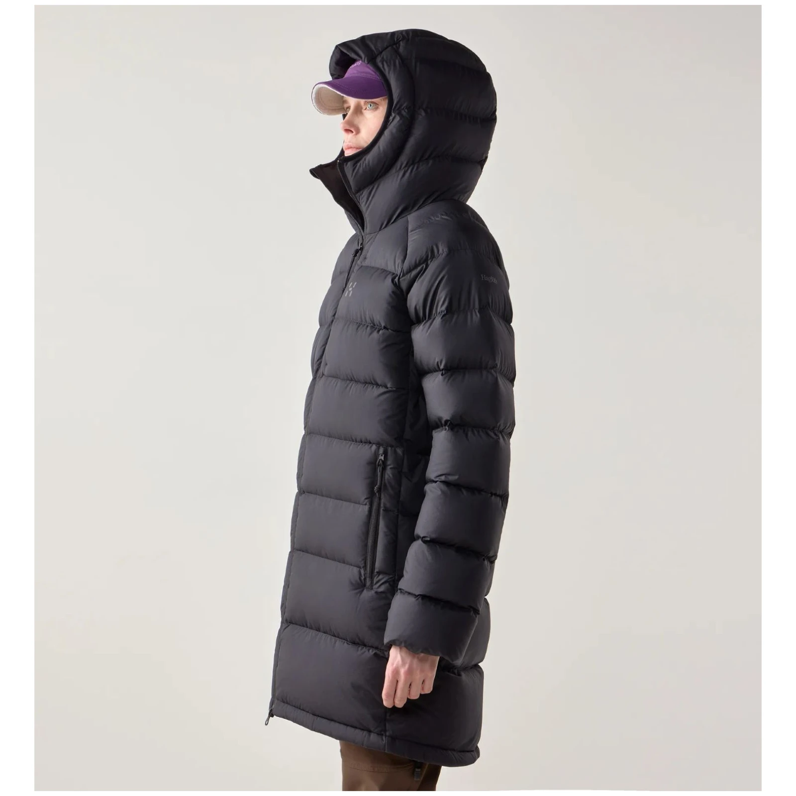 Geaca de puf pentru femei Haglöfs Rosson Down Parka este concepută pentru condiții de frig și vânt, atât în oraș, cât și în timpul activităților ușoare în aer liber. Materialul exterior este Pertex® Quantum ripstop rezistent, din poliester 100% reciclat, care este tratat cu un finisaj hidrofug fără PFC. Izolația principală este formată din puf 600 CUIN (80% puf de rață, 20% pene mici de rață) certificat conform standardului Responsible Down Standard (RDS), oferă o excelentă protecție termică.În zonele predispuse la uzură, cum ar fi gluga și umerii, este adăugat izolator sintetic Mimic Silver din poliester reciclat de 100 g/m², care își menține căldura și rezistența la vânt.