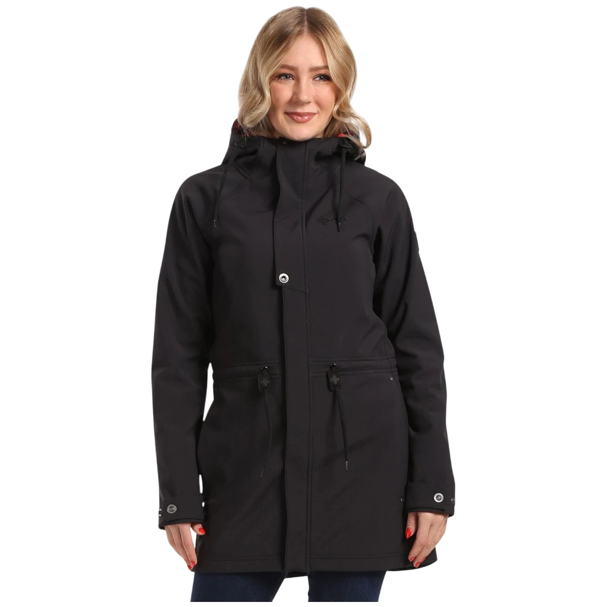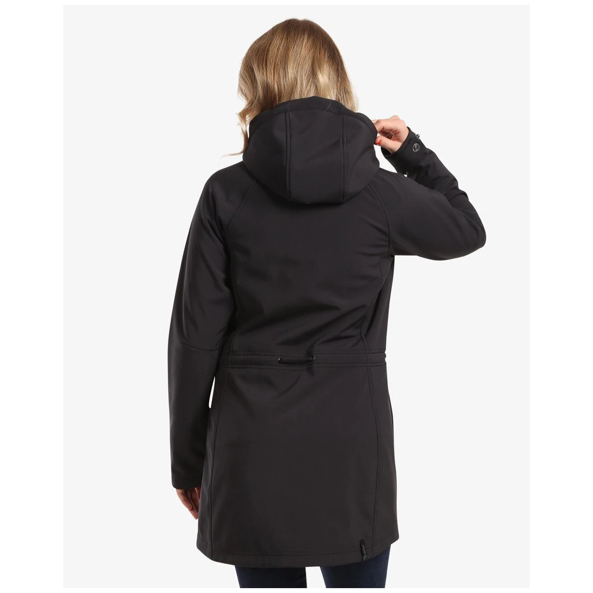 Paltonul este confecționat din material softshell rezistent, cu o membrană care te protejează de vânt și ploaie ușoară. Gluga spațioasă, cu căptușeală contrastantă, poate fi ajustată ușor cu ajutorul șnururilor. Fermoarul principal este acoperit cu o clapetă pentru a te proteja de vânt, iar mânecile pot fi ajustate cu capse metalice. Datorită șnurului de strângere din talie, haina evidențiază elegant silueta feminină, iar cele două buzunare cu fermoar oferă spațiu practic pentru obiecte mici.