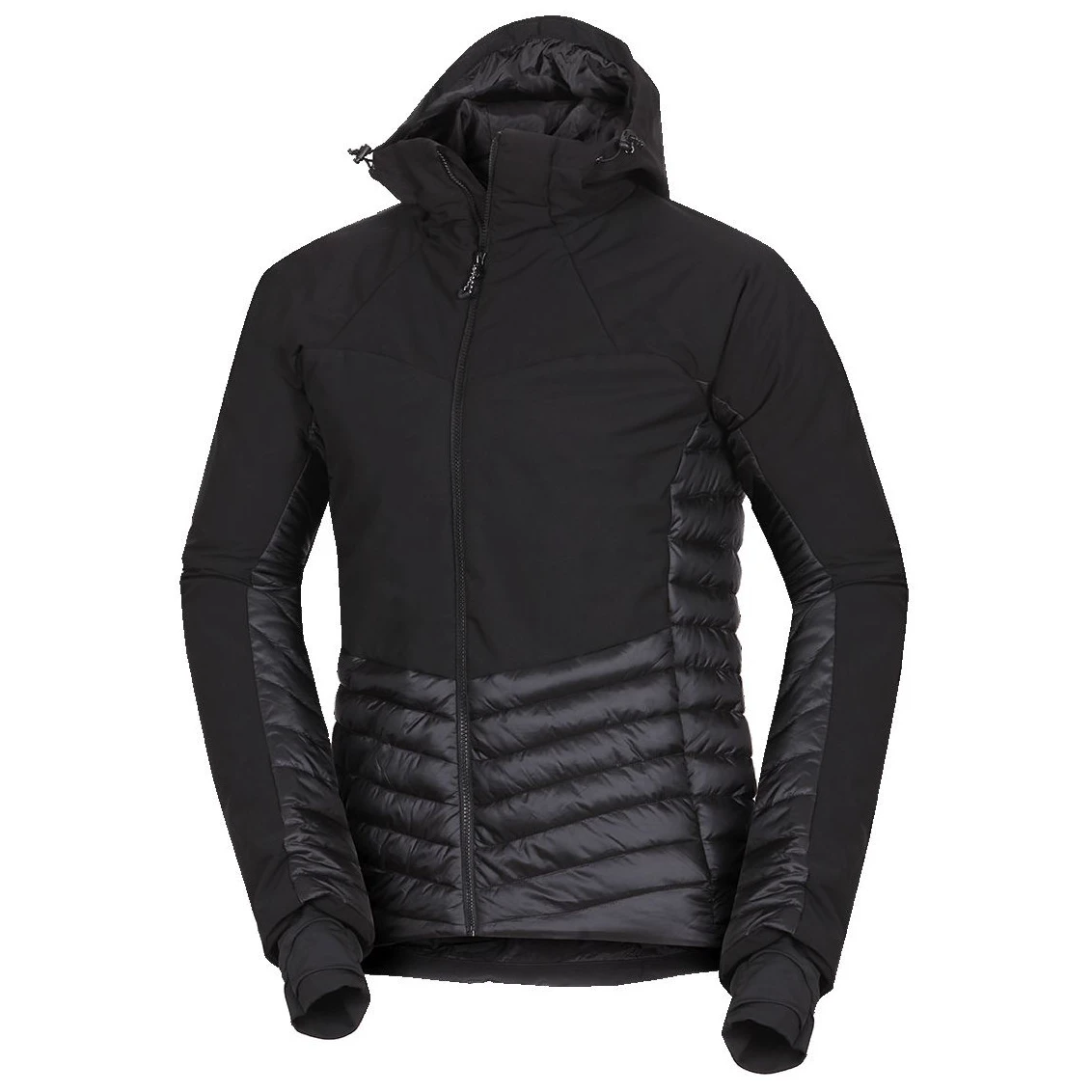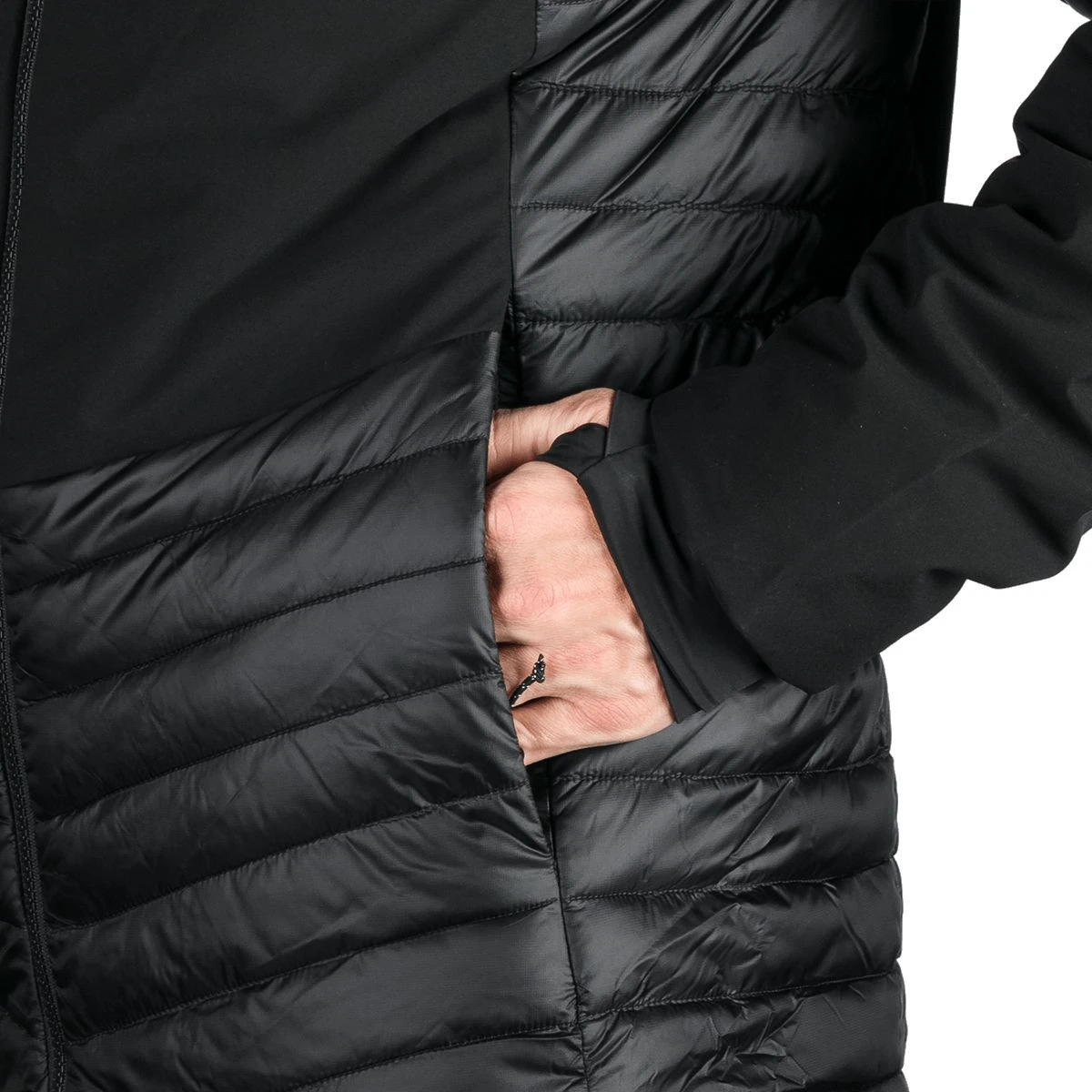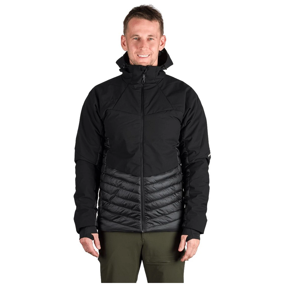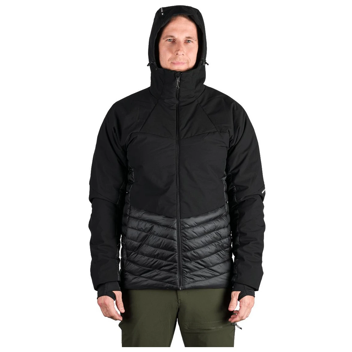 Partea superioară din softshell ușor cu trei straturi și membrană 20 000 mm H₂O / 20 000 g/m²/24 h protejează împotriva vântului puternic și a ploii, în timp ce panourile din față și spate cu membrană de 2,5 straturi 10 000 mm H₂O / 10 000 g/m²/24 h asigură lejeritate și respirabilitate. Partea inferioară, lateralele și interiorul mânecilor, căptușite cu țesătură matlasată cu tratament WR fără PFC, sporesc confortul în timpul mișcării.