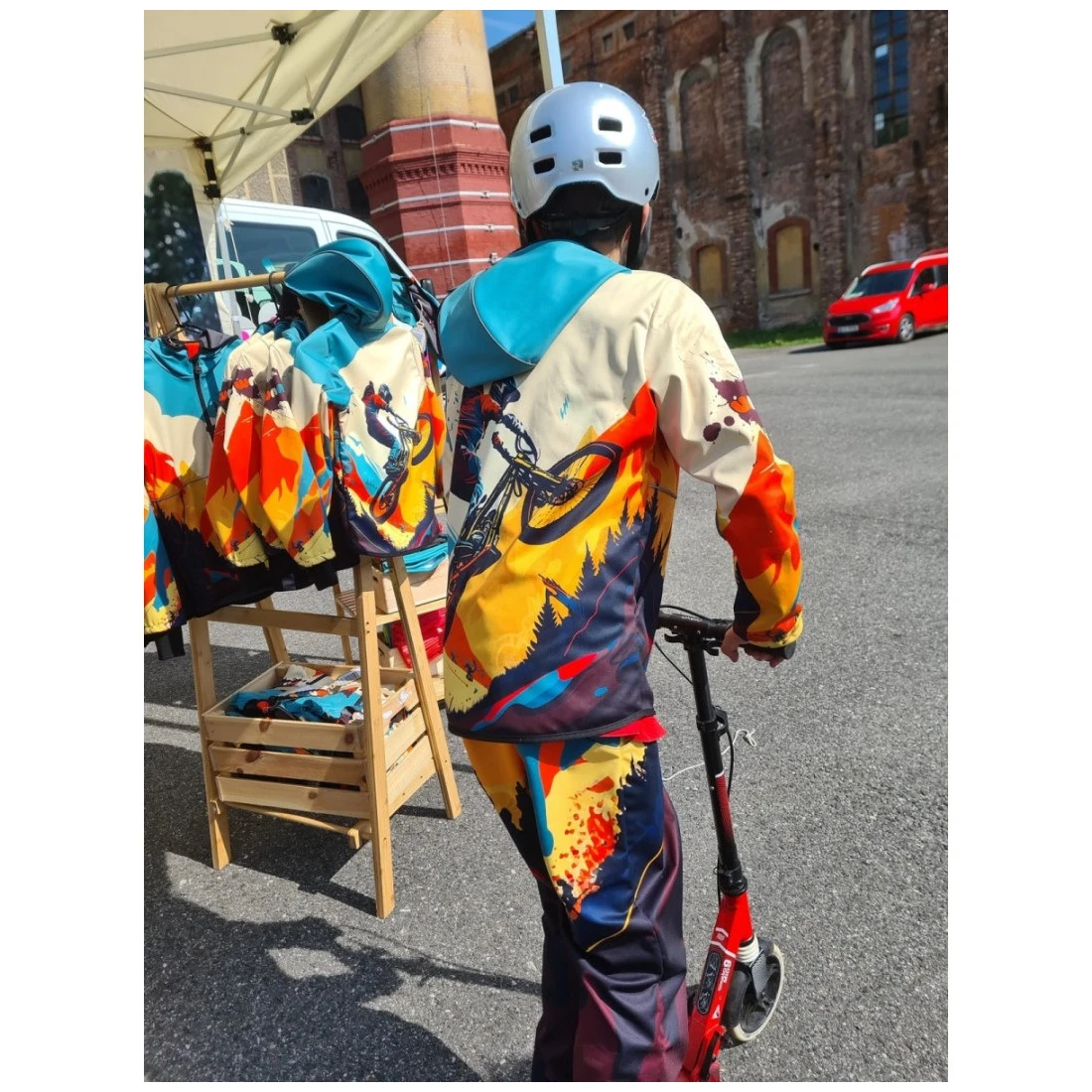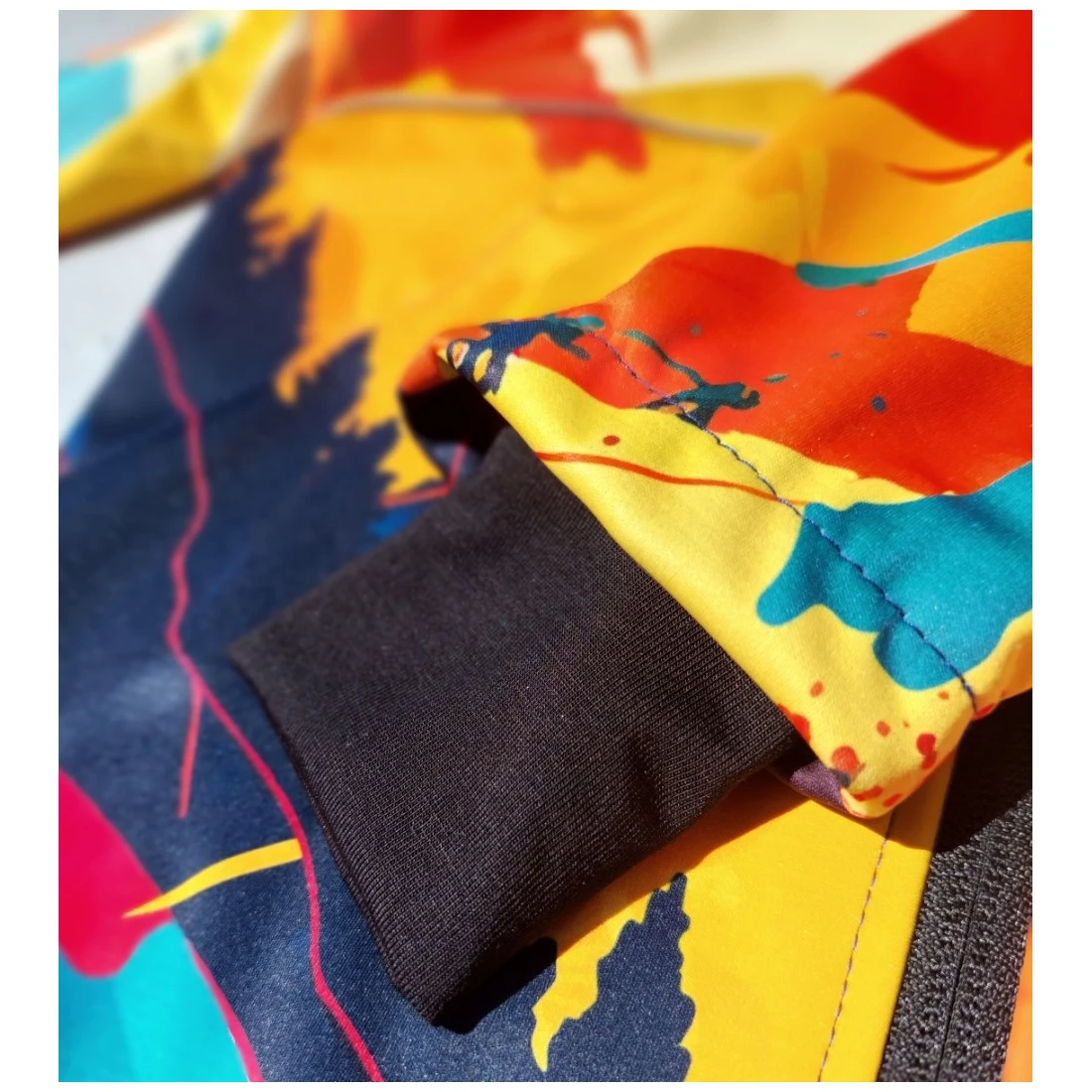 Designurile unice sunt imprimate pe softshell prin imprimare prin sublimare, proces în care materialul este comprimat la presiune înaltă. Softshell-ul poate părea temporar mai subțire. Cu toate acestea, materialul este încă potrivit pentru condiții meteorologice reci. Grosimea materialului va reveni la starea inițială după prima spălare.
