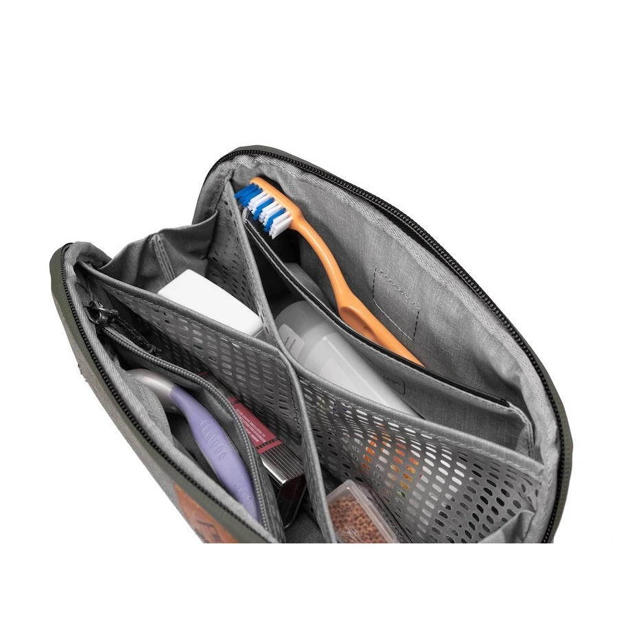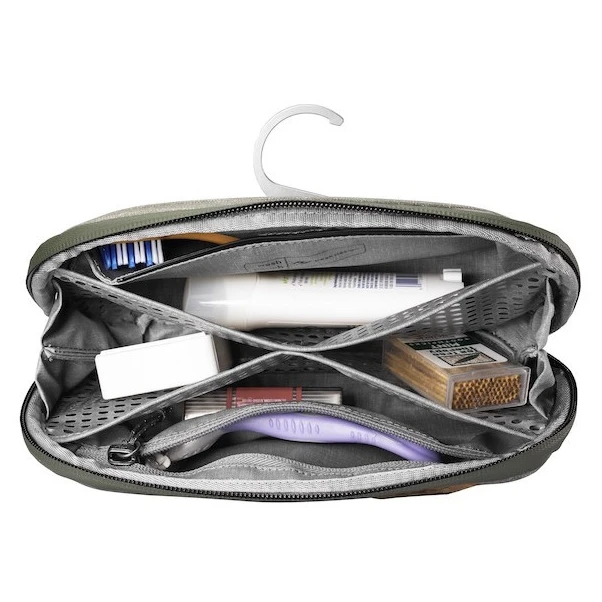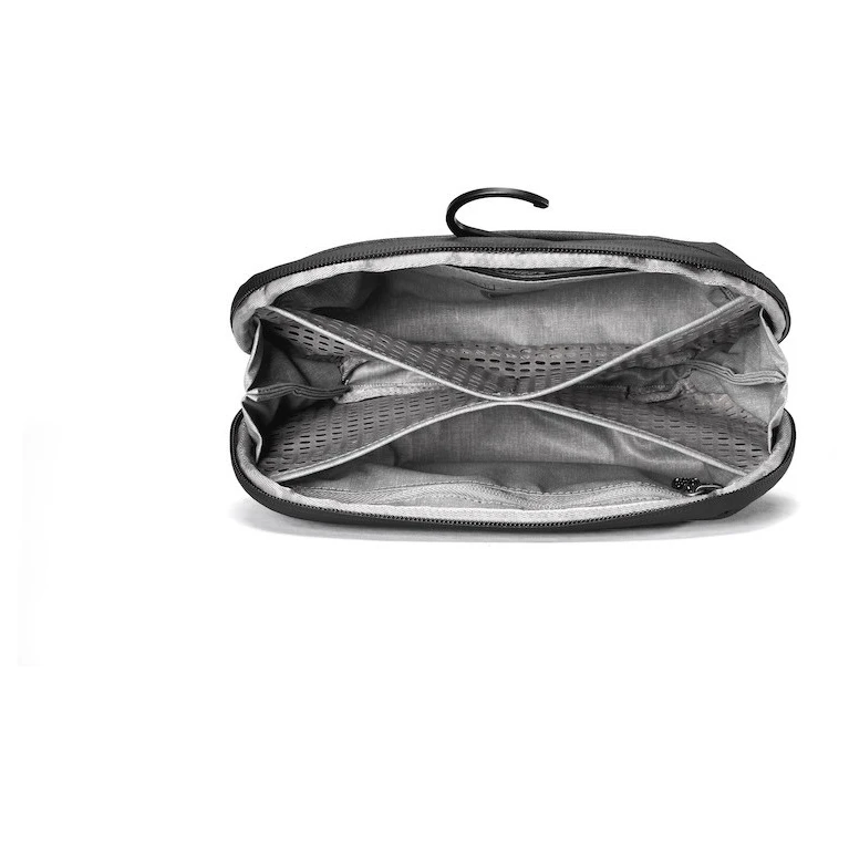 Datorită cârligului integrat din duraluminiu, geanta poate fi agățată convenabil sau poate fi așezată vertical pe o suprafață plană. Interiorul este echipat cu separatoare interne din plasă acoperită cu silicon, un buzunar cu închidere magnetică pentru periuța de dinți și alte buzunare pentru articole de toaletă mici.