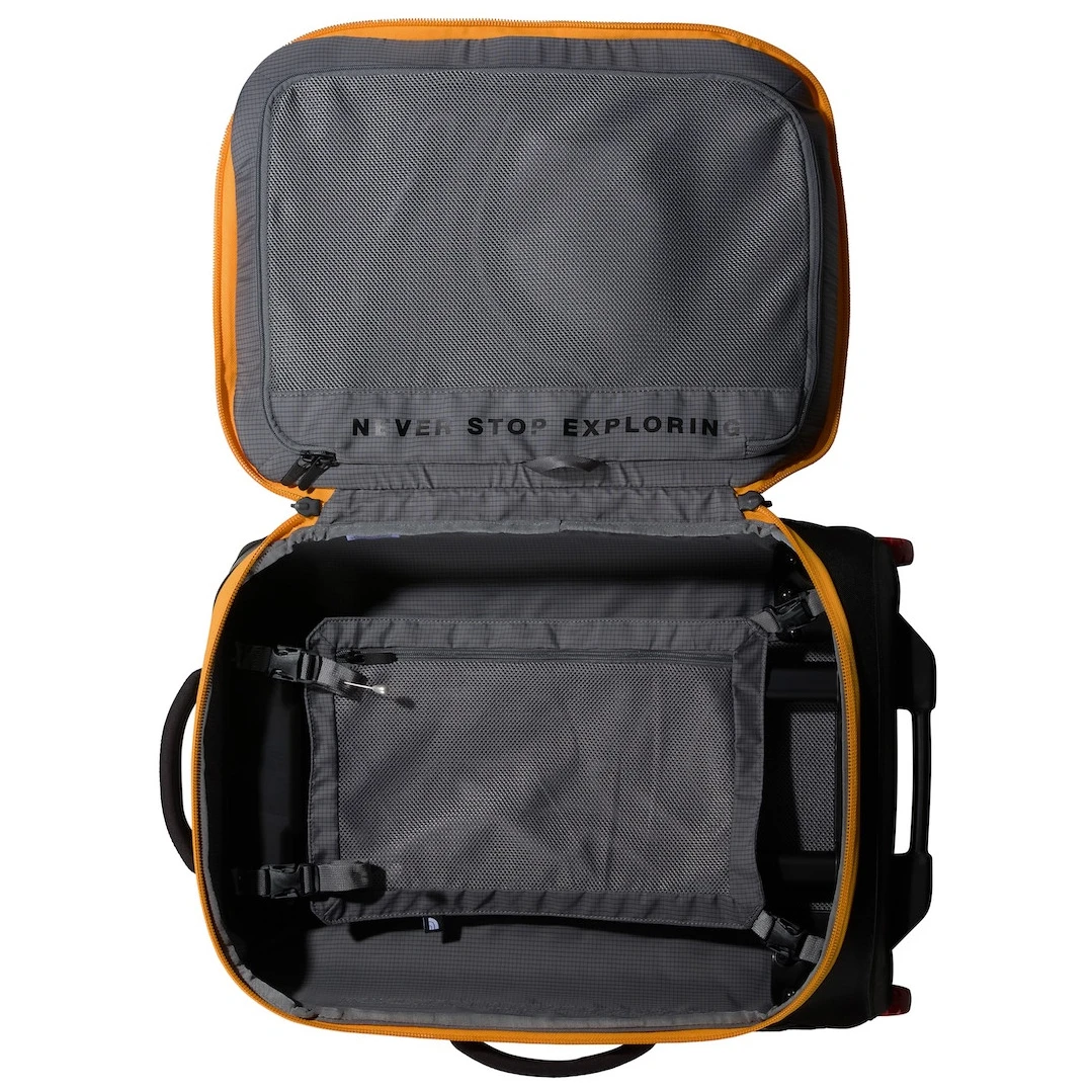 Trolerul de călătorie Base Camp Rolling Thunder 22 de la The North Face combină rezistența fără compromisuri cu caracterul practic ridicat. Este fabricat din poliester reciclat cu un strat PVC fără ftalați și este pregătit să facă față chiar și celor mai dificile condiții și călătorii în întreaga lume. Datorită dimensiunilor sale, o puteți lua ca bagaj de cabină la majoritatea companiilor aeriene.