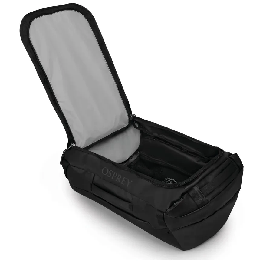Transporter 65 universal de voiaj/ghiozdan de la marca americană Osprey combină avantajele ambelor. Spațiu generos în interior, ambalare ușoară și vizibilitate bună ca o geantă de călătorie, curele de umăr confortabile, curele de compresie laterale și material rezistent ca un rucsac.