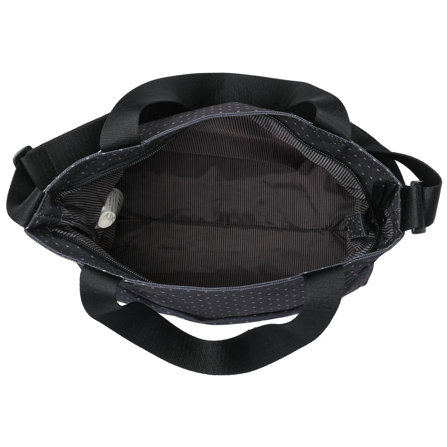 Pentru o organizare ușoară, geanta are, de asemenea, un buzunar exterior cu fermoar, unde poți pune lucrurile de care ai nevoie rapid, și un buzunar interior cu fermoar pentru depozitarea în siguranță a obiectelor de valoare. Cureaua de umăr reglabilă permite purtarea confortabilă pe umăr sau încrucișat, în timp ce mânerele fixe oferă posibilitatea de a o purta și în mână.