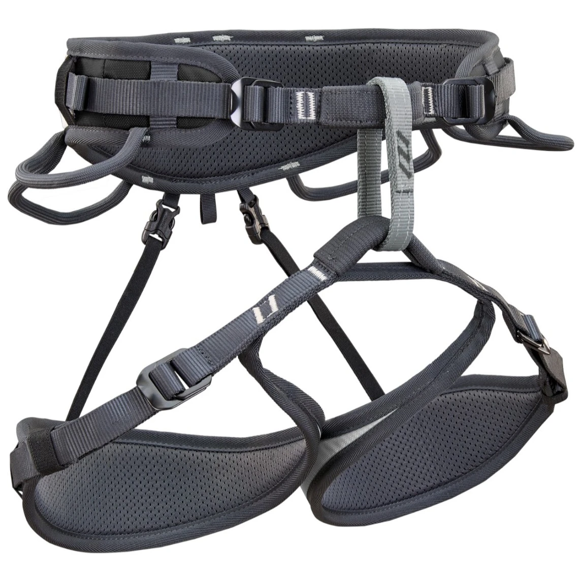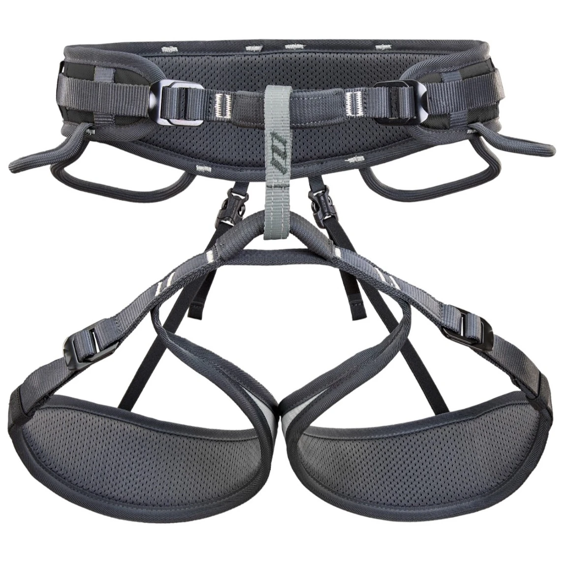 Cele patru catarame de reglare permit o potrivire precisă a taliei și a picioarelor în funcție de corp și de stratul de îmbrăcăminte. Centura ergonomică pentru talie și pernițele pentru picioare asigură o distribuție uniformă a sarcinii și confort la agățare, fără a limita mișcarea.