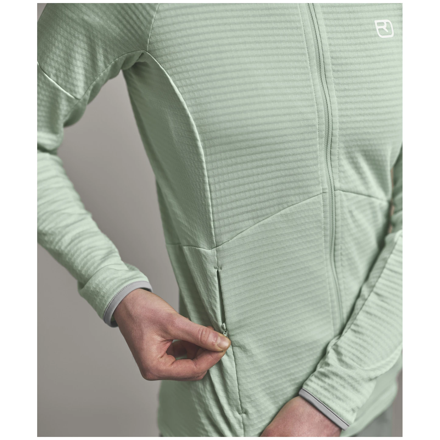 Dama de fleece Ortovox Fleece Light Hoody te va sprijini în momentele în care fiecare gram de echipament contează în munți, dar totuși nu vrei să renunți la confortul termic. Această stratificare ușoară combină în mod expert căldura cu volumul minim, făcând-o o piesă indispensabilă pentru ascensiunile tale solicitante și drumețiile pe distanțe lungi.