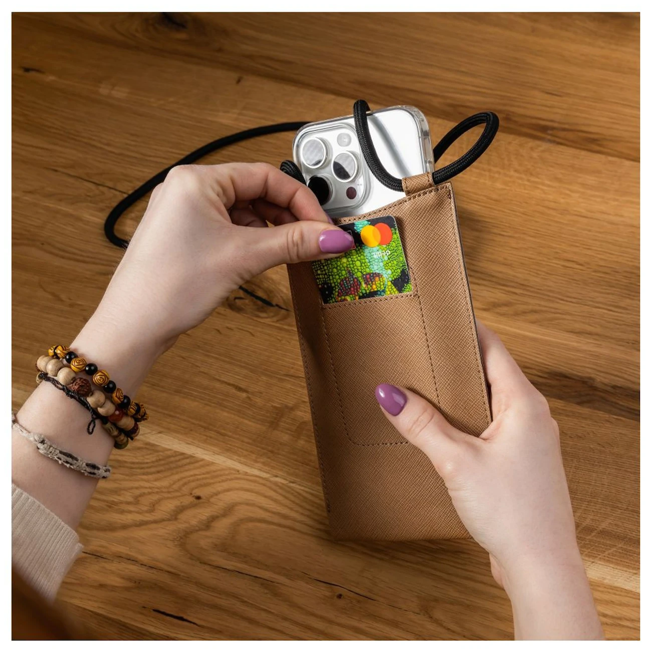Husa este fabricată în atelierul Prostějov din piele sintetică de calitate cu design Saffiano. Acest material este rezistent la zgârieturi, are un aspect elegant și este foarte plăcut la atingere. Șnurul fix are o lungime reglabilă, astfel încât husa poate fi purtată ca crossbody.