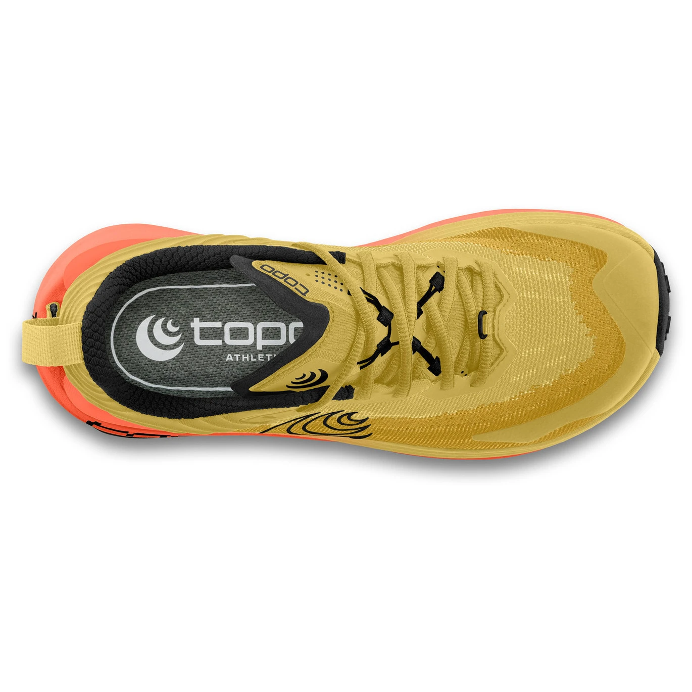 Pantofii de trail running Topo Vista sunt proiectați pentru teren tehnic, unde este nevoie de amortizare maximă și tracțiune fiabilă. Talpa intermediară ZipFoam™ cu înălțimea de 38 mm în călcâi și 33 mm în partea din față oferă un pas moale și, în același timp, o revenire excelentă. Forma Rocker asigură o tranziție lină de la impact la impuls și economisește energie pe traseele lungi.